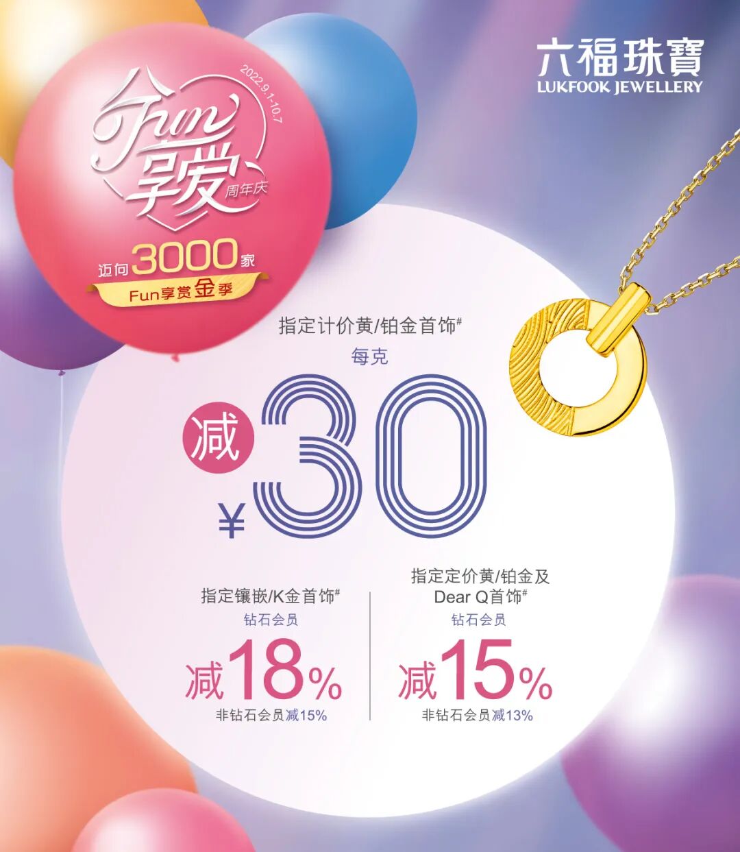 #以上折扣优惠均以商品标签价格及当天六福珠宝全国统一金价为计价基础,并以每张保证单的实付金额计算;特价、授权精品、电铸摆件、金章、金条,不参与上述折扣优惠活动;*会员累积消费满3,000积分(以系统显示积分为准,不包含赠送积分,如生日积分奖赏、活动积分奖赏等)即可获得参与资格;活动于2022年9月1日早上10:00开始,推广期间每周四上架15件,共上架6次,合计90件;每位符合资格会员仅限兑换一份盲盒,礼品款式由系统随机选取,并将于六福珠宝官方微信公众号发布之推文中展示,数量有限,换完即止,积分一旦扣除,不作退回,逾期未兑换视为自动放弃;▽活动期间惠顾Goldstyle小“圆”份套装中项链、手链、耳钉、吊坠任意一款均可参加;活动期结束后,六福珠宝将统一进行抽奖(免单奖赏名额共1位,免单奖赏为单笔保证单内,定价最低的指定款产品免单,免单奖中奖者将有专人与中奖者联络沟通兑奖事宜;金章奖赏价值198元,名额共6位),得奖名单将于11月25日或之前公布,并以短信形式通知获奖会员及领取奖品,获奖者需于12月5日或之前于会员小程序内领奖,逾期领取即视为放弃,实物奖品将于截止后30个工作日内邮寄到得奖者所选定之门店。^每位钻石会员于推广期内仅限享受一次积分奖赏,会员累积积分须于付款前提供会员卡号,否则视为放弃;活动过程中,因会员退货或遇用户通过其他不正当手段(包括但不限于使用第三方软件或利用系统漏洞等)参与活动,本司核实情况后有权取消其兑换资格,并回收用户已获得的六福珠宝会员礼品,针对作弊情节严重者,必要时将追究其法律责任;除会员积分、会员积分抵扣计划外,不可与其他优惠同时使用(含会员折扣、其它活动优惠券、以旧换新);图片仅供参考;所有优惠受条款及细则约束;详情请向店员查询。