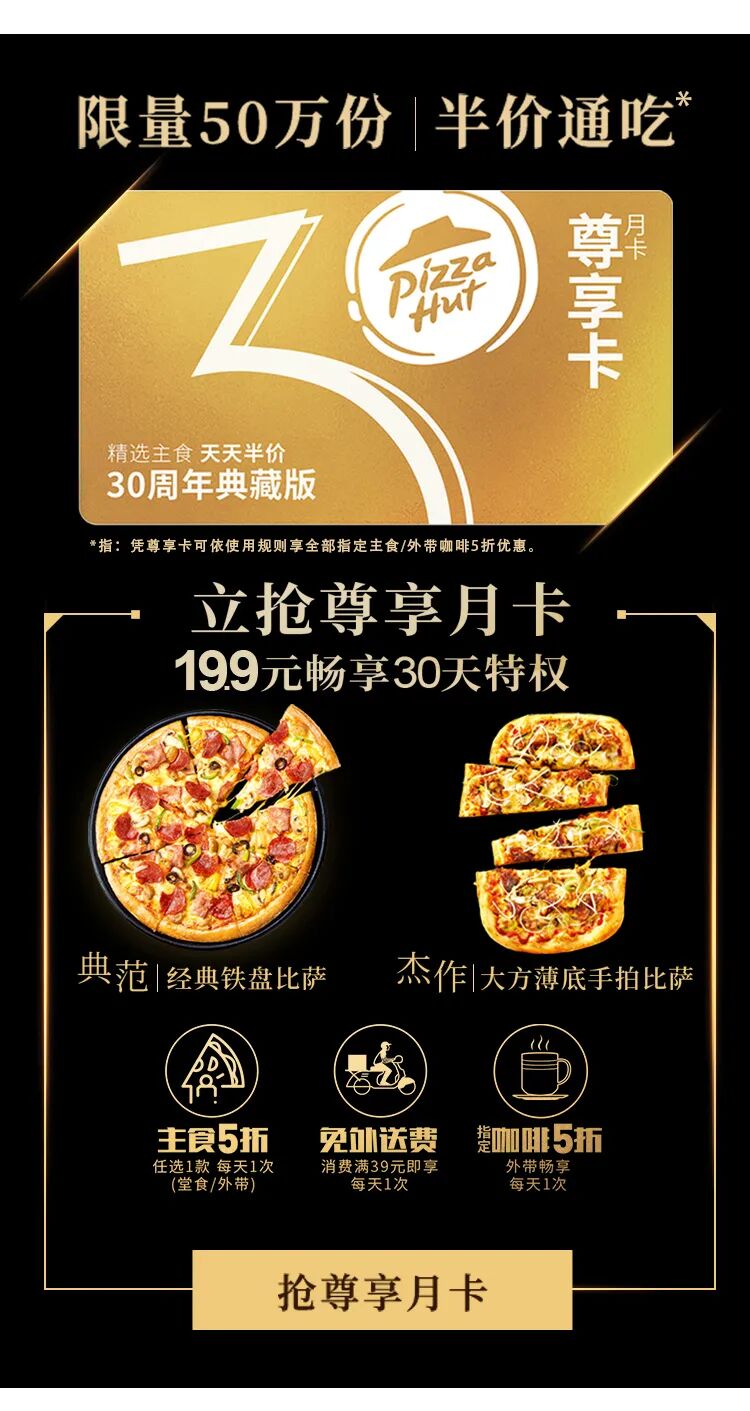 一. 本卡自2020年8月8日起售,限量50万份,售完即止。含会员权益如下:①【堂食+外带|月卡(30天)】5折享精选主食:在指定必胜客欢乐餐厅,以单品价点购指定精选主食1份,可享5折优惠; 有效期:生效后30天内; 有效期内可用次数:每天限使用1次;②【扫码+外带|月卡(30天)】5折享精选外带咖啡:在指定必胜客欢乐餐厅,以单品价点购指定精选咖啡1份,可享5折优惠; 有效期:生效后30天内; 有效期内可用次数:每天限使用1次;【宅急送|月卡(30天)】官网点餐消费满39元免外送费:在必胜客宅急送官方网络订餐单笔消费产品满39元可享免外送费优惠; 本权益有效期:自领取之日起30天内有效。为了配合防控行动,部分餐厅营业时间有所调整,具体请咨询必胜客在线客服,在线客服工作时间(9:00-22:00); 本权益可使用次数:30次,每天仅限使用1次。
