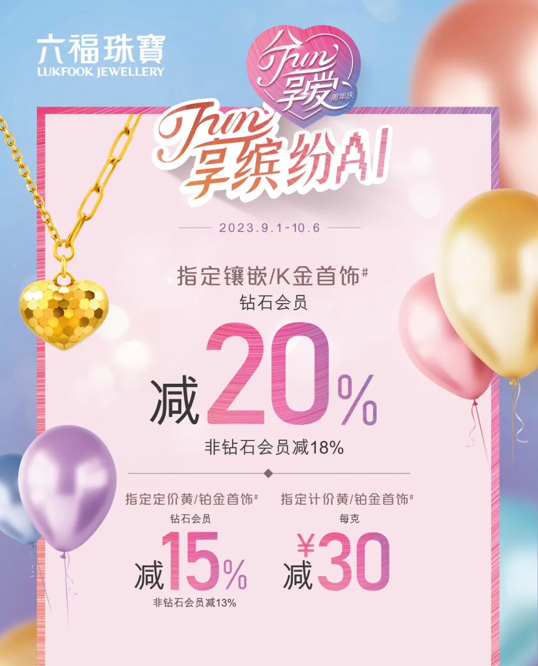 #以上折扣优惠均以商品标签价格及当天六福珠宝全国统一金价为计价基础,并以每张保证单的实付金额计算;以上优惠只适用于中国内地之六福珠宝门店。特价、授权精品、电铸摆件、金章、金条,不参与上述折扣优惠活动;除会员积分、会员积分抵扣计划外,不可与其他优惠同时使用(含会员折扣、其它活动优惠券、以旧换新);*0.1克足金工艺品数量有限赠完即止;△会员在实体门店任意消费即可获得兑换资格;活动期间每周五早上10:00于会员小程序「积分商城」上架实物盲盒20份及电子礼券30份,共上架6次,合计300份;每位符合条件之会员仅限兑换实物盲盒或电子礼券1次及换领1件,数量有限,兑完即止,积分一旦扣除,不作退回,逾期未兑换视为自动放弃;实物盲盒款式由系统随机选取,更多详情可查阅「积分商城」内礼品详情及兑换规则;^推广期内填写纪念日即可获得抽奖资格,推广期结束后于符合参与抽奖资格者中随机抽取10位送出指定精美首饰盒各1份(价值约99元);中奖者将于10月13日或之前于会员小程序内公布并以短信形式通知,中奖者须于10月20日或之前进入会员小程序点击领取,逾期视为自动放弃,奖品将于中奖者领取后15个工作日内邮寄至其选定之门店;活动过程中,因会员退货或遇用户通过其他不正当手段(包括但不限于使用第三方软件或利用系统漏洞等)参与活动,本司核实情况后有权取消其参与资格,并回收用户恶意已获得的礼品,必要时追究其法律责任;六福集团之员工均不得参与上述会员活动,以示公允;图片仅供参考,所有优惠及会员尊享礼遇受条款及细则约束,详情请向店员查询。