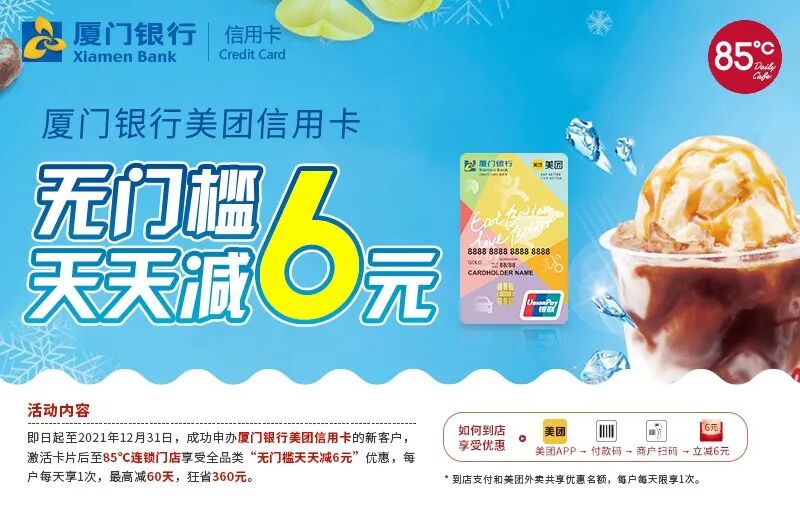 厦门银行美团联名信用卡,每日首笔立减6元(无门槛)最长享受60天。