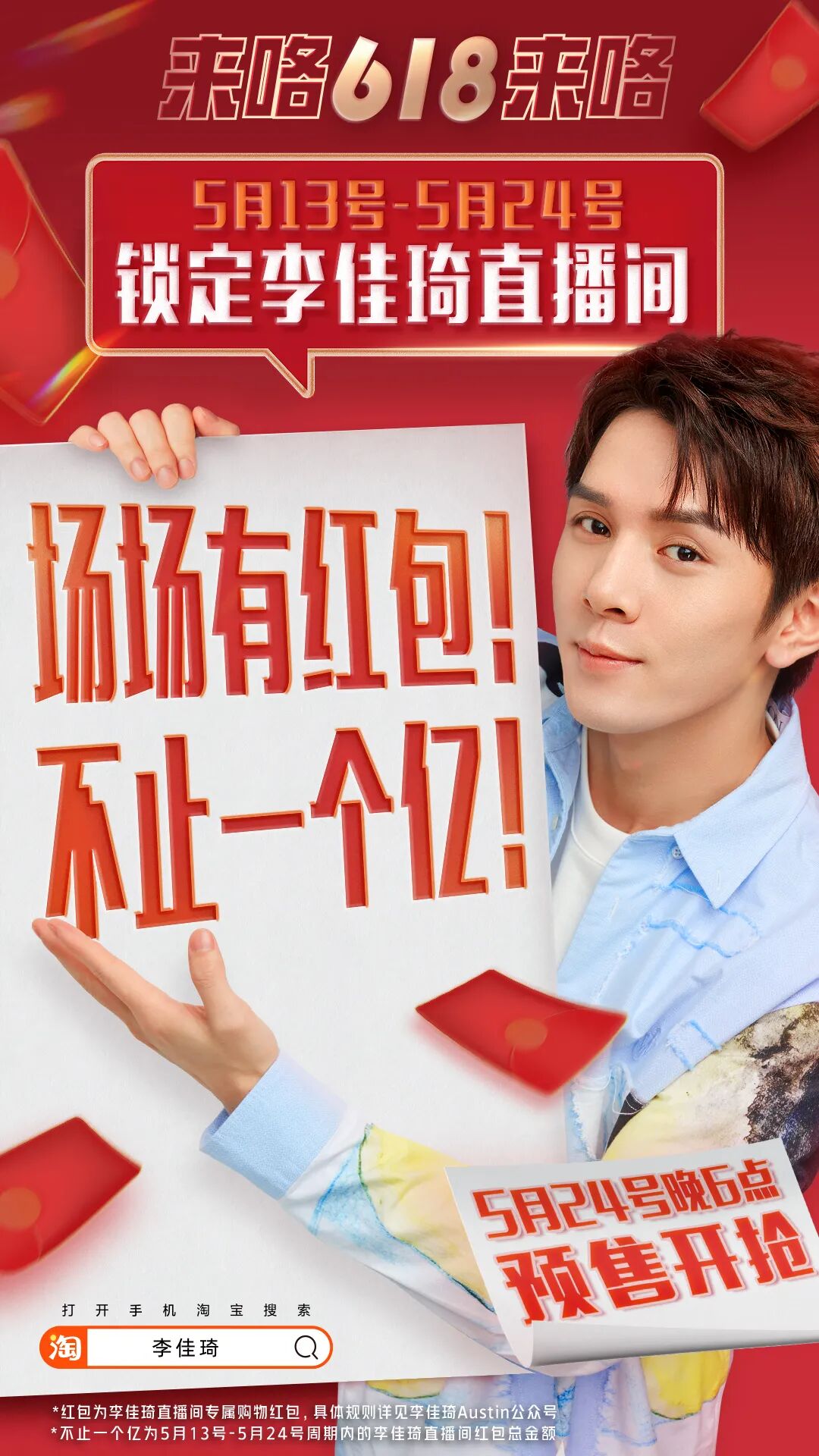 1.红包为李佳琦直播间专属红包(红包雨红包及宠粉红包),5月13日-5月24日,关注李佳琦直播间领取,活动期间红包总金额为120000000元,红包数量为5000万个,单个用户可多次领取。