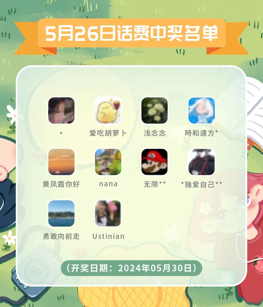 1、恭喜以上10位小伙伴获得5月26日活动100元电信话费,我们已通过留言方式回复了您。请您用本人微信按“0526话费+微信昵称+手机号”的格式于6月6日10点前,留言回复您的电话号码,逾期或回复格式不正确的小伙伴视为自动放弃。