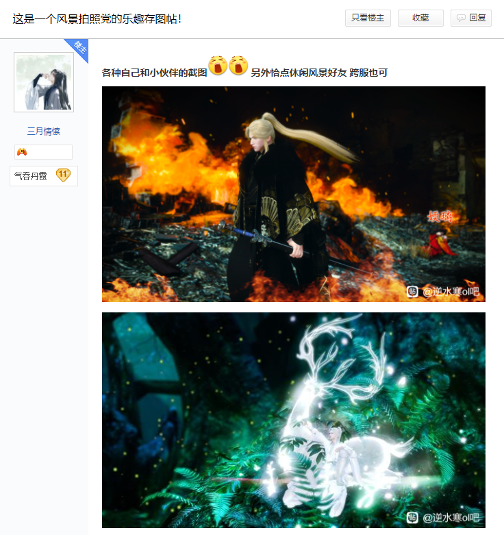 在江湖的日子越来越久,三月情愫也积攒了越来越多的截图作品,于是他开始在贴吧发帖,分享自己江湖生活中的点滴日常及拍照地点。