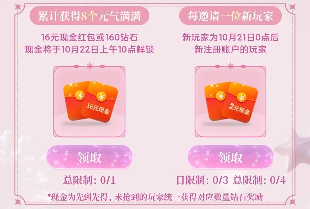 累计获得8个元气满满可得16元现金,每邀请一位新玩家还可领取2元现金(16元现金奖励将于10月22日10:00开放领取;新注册账号的新玩家需为10月21日0点之后注册,邀请新注册账号的新玩家的奖励单日限制领取3次,总限制领取4次)~
