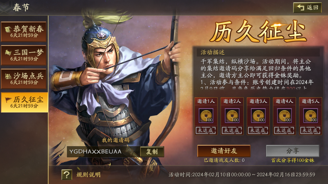届时主公每天参与活动并分享活动,可得700金铢与潼关之战五星纪念卡。