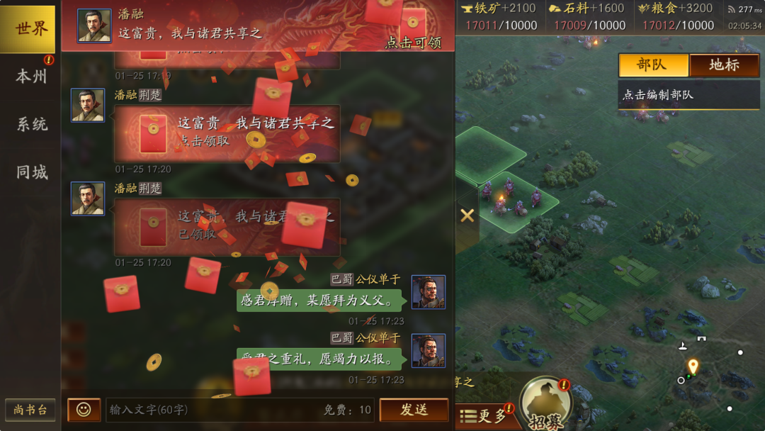 活动介绍:2月7日起,游戏内将上线金铢红包玩法,主公们通过特定界面获取红包后可在世界/同盟频道上发放对应春节红包,具体获取条件与详细规则将会后续公布。