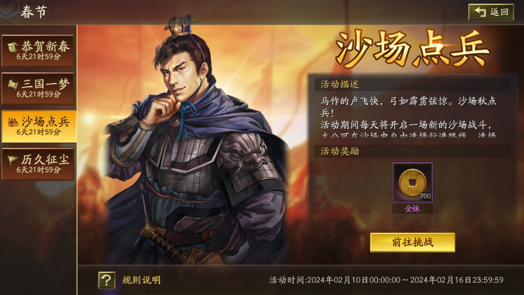 活动介绍:体验过曹操传与马超传里的主公相信对于其中沙场战斗并不陌生,这次春节期间每天将开启一场经典三国战役,主公可自由选择行进路线,点兵点将,从而顺利通关!