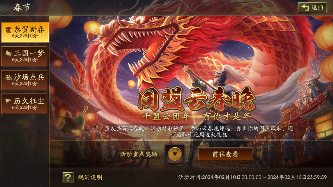 龙舞三国庆,盟聚贺新年!春节临近,游戏内春节活动如约而至,事不宜迟,小乔姐姐带大家看看都有哪些活动和奖励!