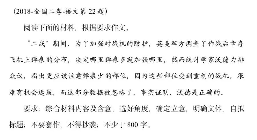 “2018年全国二卷语文作文题,关于飞机上留下弹痕的作文。当时考试前也复习了历年不少的作文题,之前大家一致认为18年高考作文应该是很主旋律,或者是很具有时代意义的。当时考试时看到这样一道哲学思辨题时,整个人都僵住了。不过后来,老师就这道题给出了十多种可能的作文立意,怎样都不会跑题。”