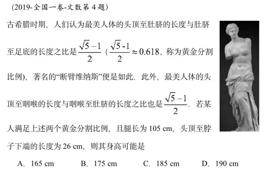 “2019年全国一卷文科数学选择题第四题,给了维纳斯的腿长,求身高。感觉很好玩哈哈哈,是用我自己的腿长估计的,对了。”