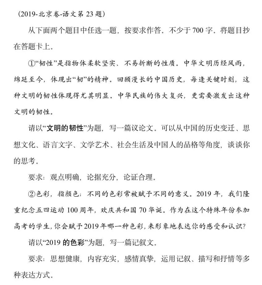 “2019年北京卷理科语文大作文,记叙议论二选一,记叙文给的题目是‘2019的色彩’。我没有选这道题,选的是议论文。这题我当时感觉非常迷惑。考试时2019才过了不到一半,怎么确定它的色彩?如果再来一次估计还是会选择写议论文。”