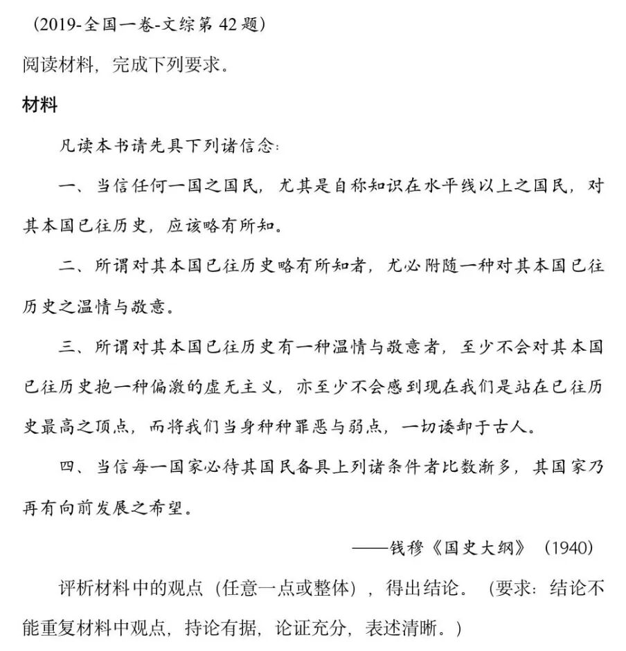 “2019年全国一卷文科历史卷关于国史大纲的一道小论文题,题目让我看得云里雾里,完全无法运用学过的知识也无法下笔。记得应该是第42题,盯着题看了15分钟才下笔,史上第一次用了25分钟写小论文题,写到最后满心都是‘写完了就行了不管了’的绝望和自我安慰混杂的感觉……”