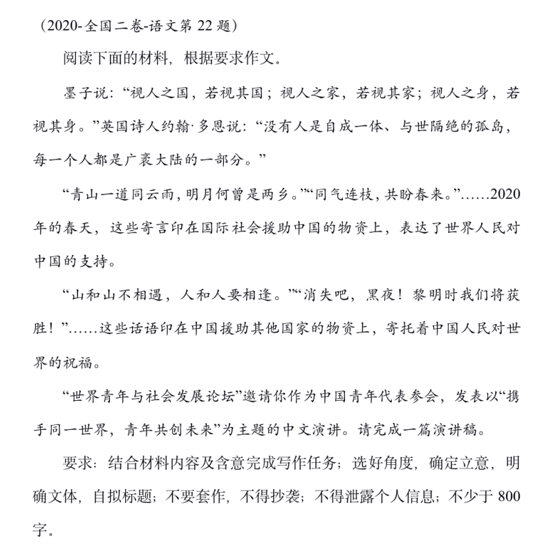 “2020年全国二卷语文作文。当时一通乱写猛如虎,一看偏题250。现在作文水平貌似有减无增,真的写不来了”