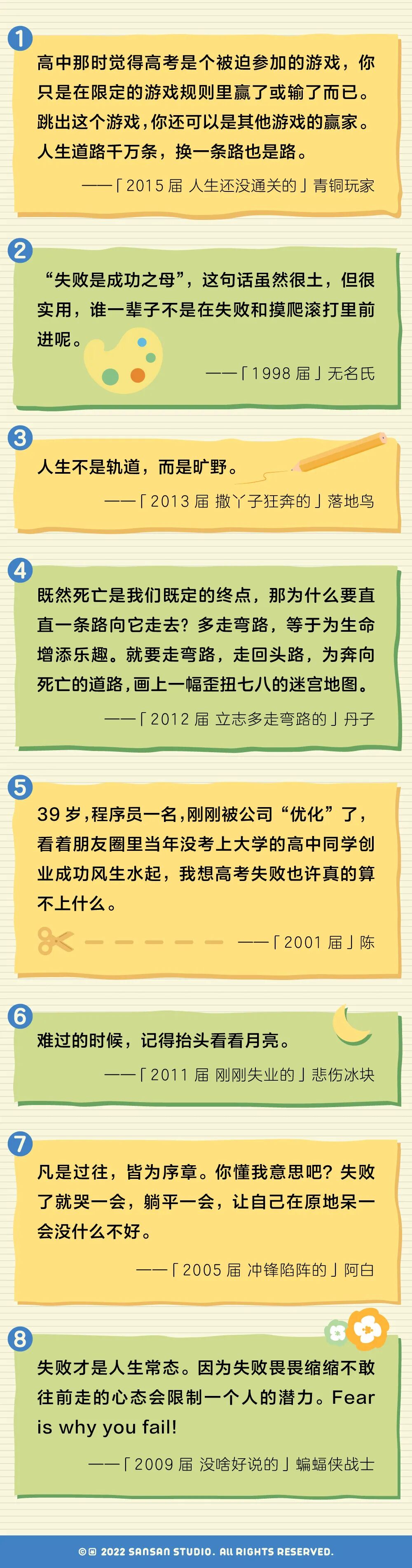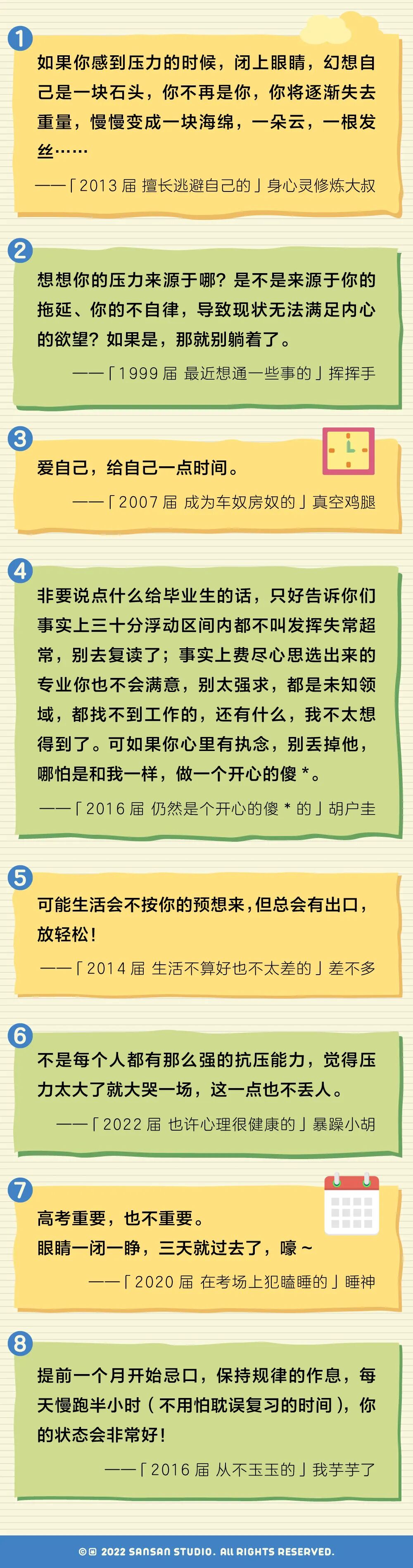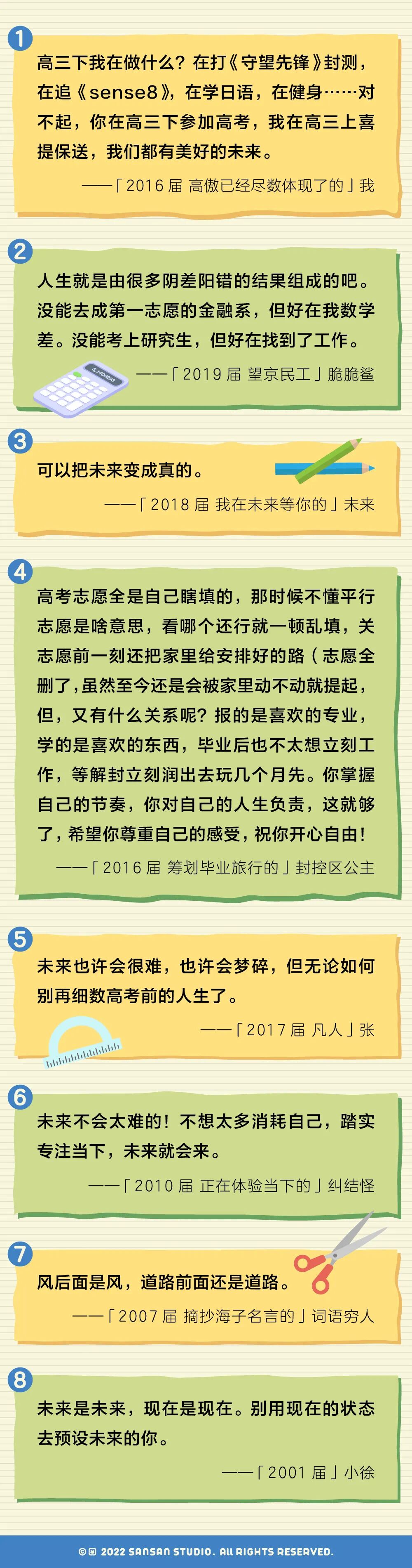 亲爱的高考生你好,我们收集了各个年龄段、来自不同地方的“过来人”为你们写下的64张小纸条。这些小纸条分属8个也许你会遇到难题的part: