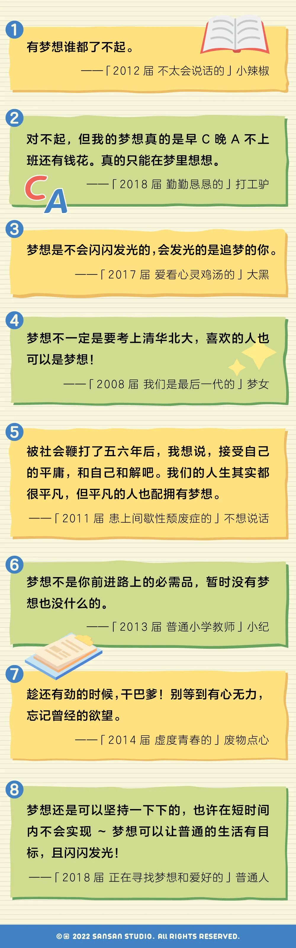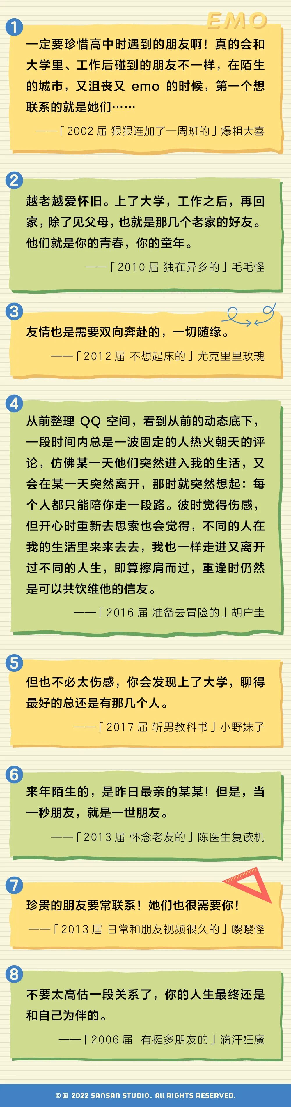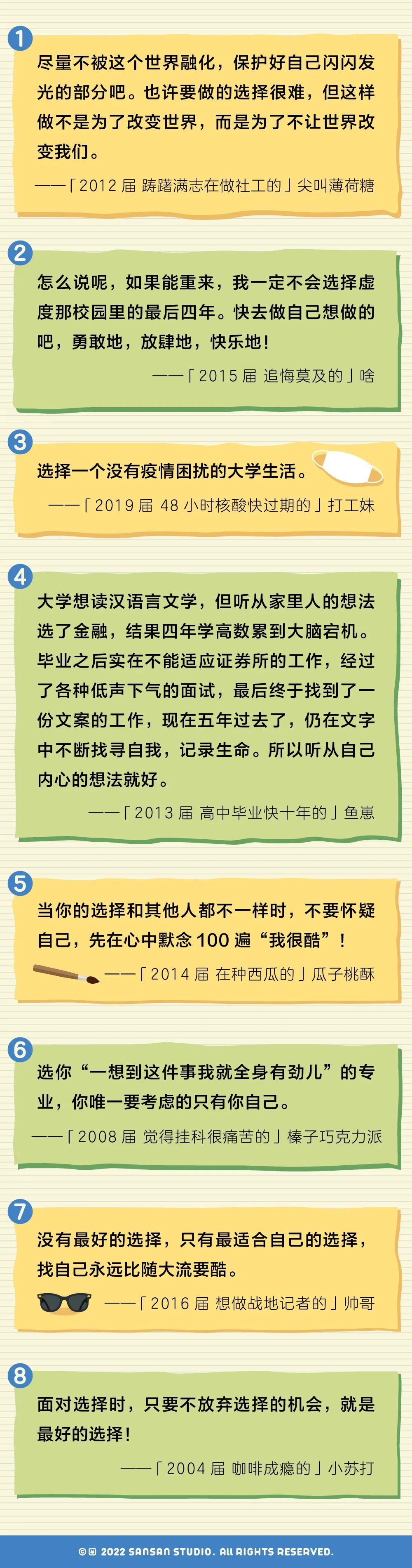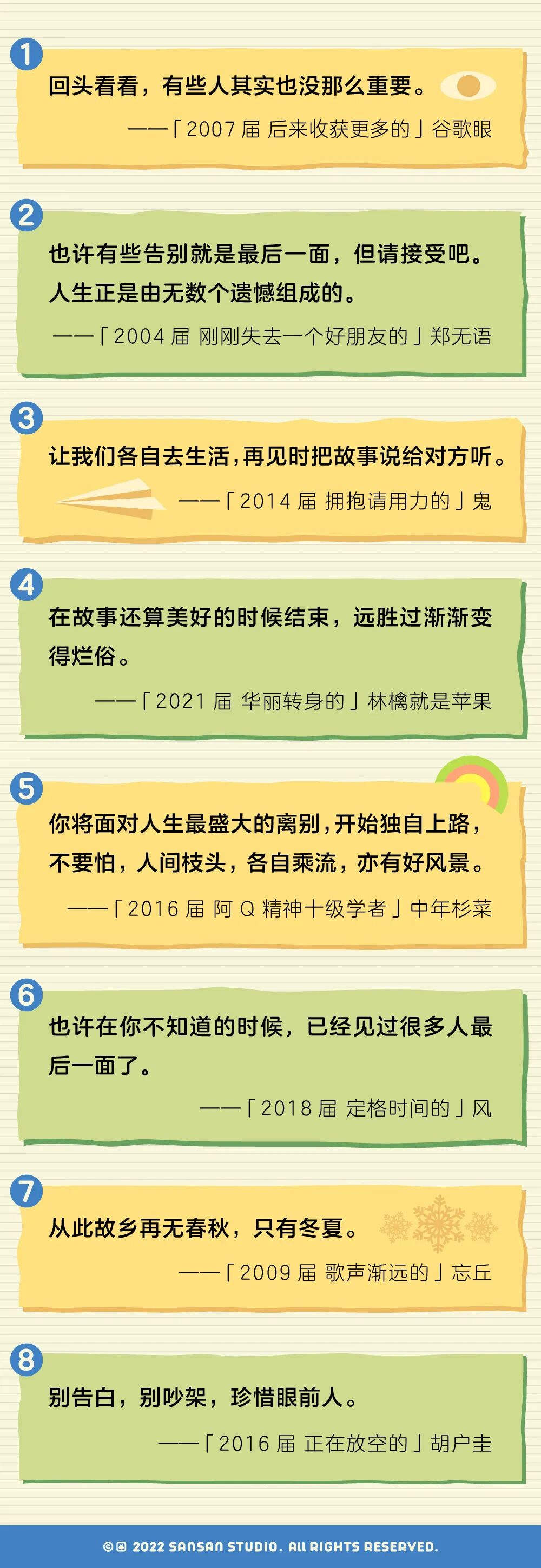 亲爱的高考生你好,我们收集了各个年龄段、来自不同地方的“过来人”为你们写下的64张小纸条。这些小纸条分属8个也许你会遇到难题的part: