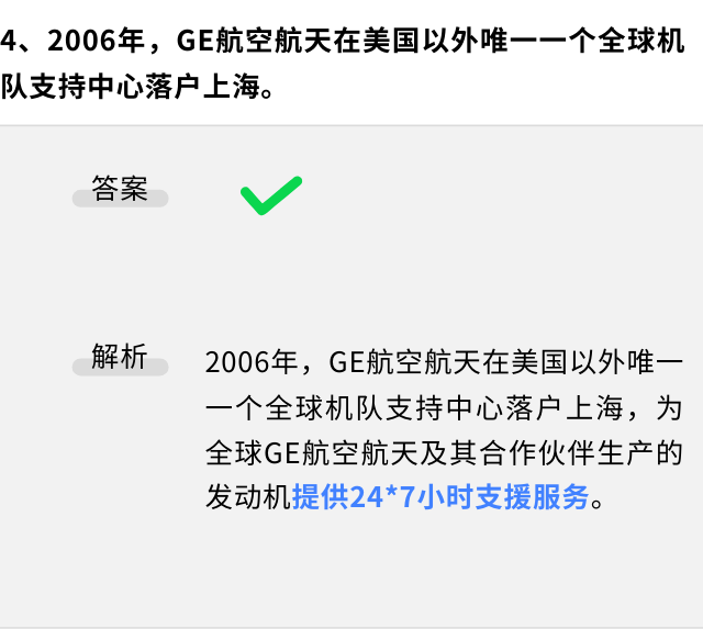 3、2023年,GE航空航天发动机现场支援服务快修厂(Quick Turn)在上海临港正式建成,此为中国民航业第 家专业发动机快修厂。