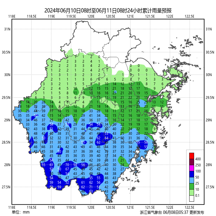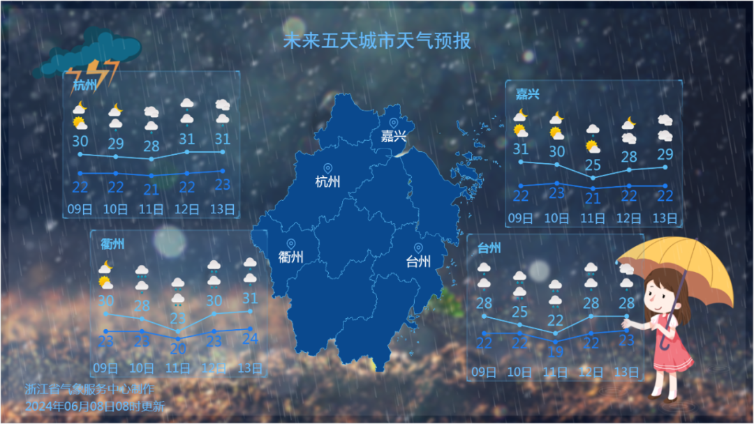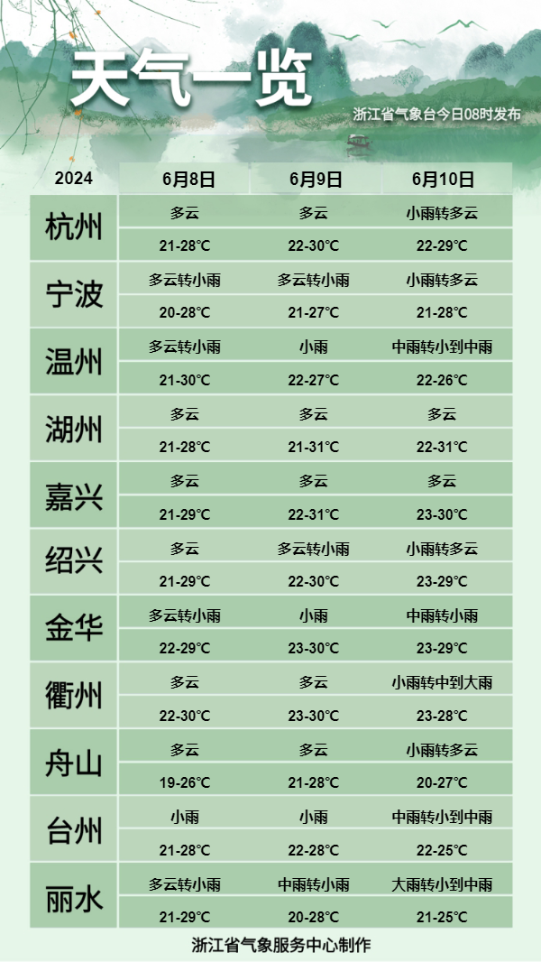 受低层切变影响,浙中南地区多阵雨或雷雨天气过程。明天(9日)起浙江南部地区进入降雨集中期,降雨持续时间长,累计雨量较大。相比今天,降雨强度还有所加强,重点还是在浙中南一带。
