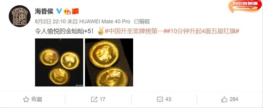 在过去17天里,在无数与奥运会相关的信息里,如果要选出一位蹭热度冠军,这位来自2000多年前,远居江西、和奥运会「八杆子打不着」的大人物,可能是强有力的竞争者。奥运会如火如荼的那几天,窝主不是去直播平台搜索当天中国队得了多少金牌,而是等海昏侯本人亲自发微博。闭幕式这一天,他老人家也霸道总裁般带着金牌再次出现。没错,海昏侯家最不缺的就是金牌,确切来说叫做「金饼」,在对海昏侯墓的考古发掘过程中,开启内棺前,出土的金饼数就已经达到了285枚,重量在230克至260克之间,接近汉代的一斤(250克)。