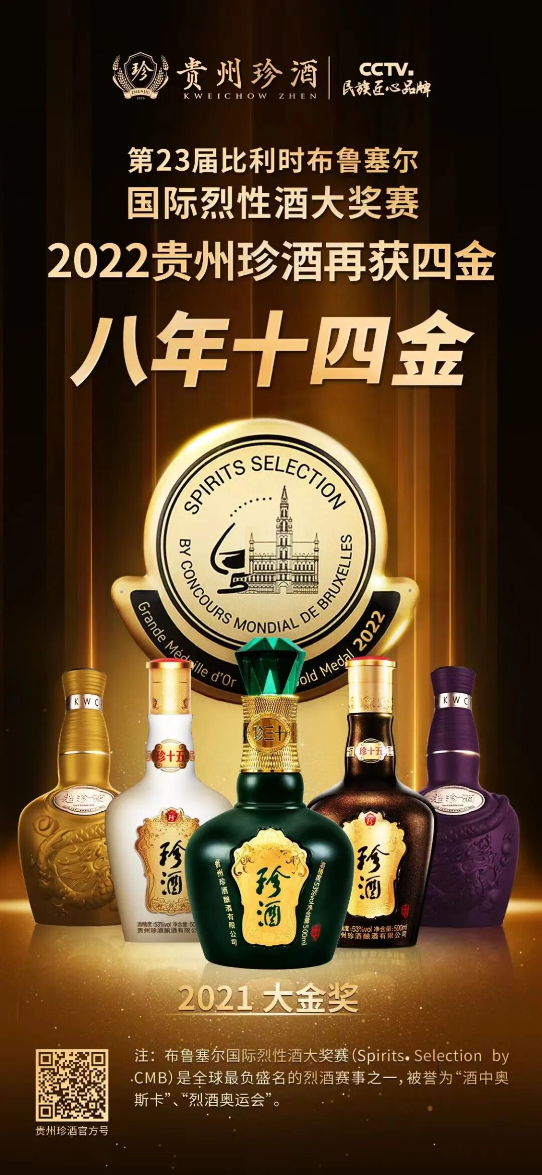 2015年-2022年比利时布鲁塞尔国际烈性酒大赛,贵州珍酒8年斩获14金,金牌收割机实至名归。