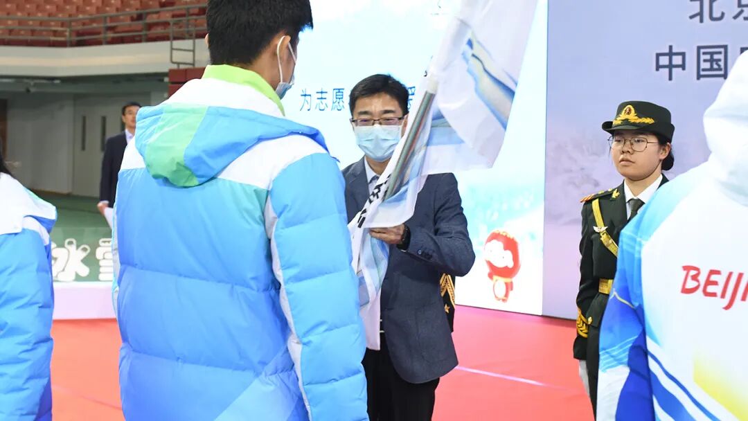 誓师大会上,姜沛民,张秀峰分别向志愿者代表授旗。