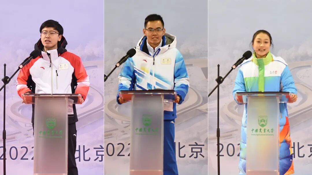 国家雪车雪橇中心志愿者经理、学校党委学生工作部副部长黄振翔,赛会志愿者代表、人文与发展学院本科生陈旭,城市志愿者代表、土地科学与技术学院本科生赵涤非分别在发言中表达了服务好北京冬奥会和冬残奥会的决心和信心。