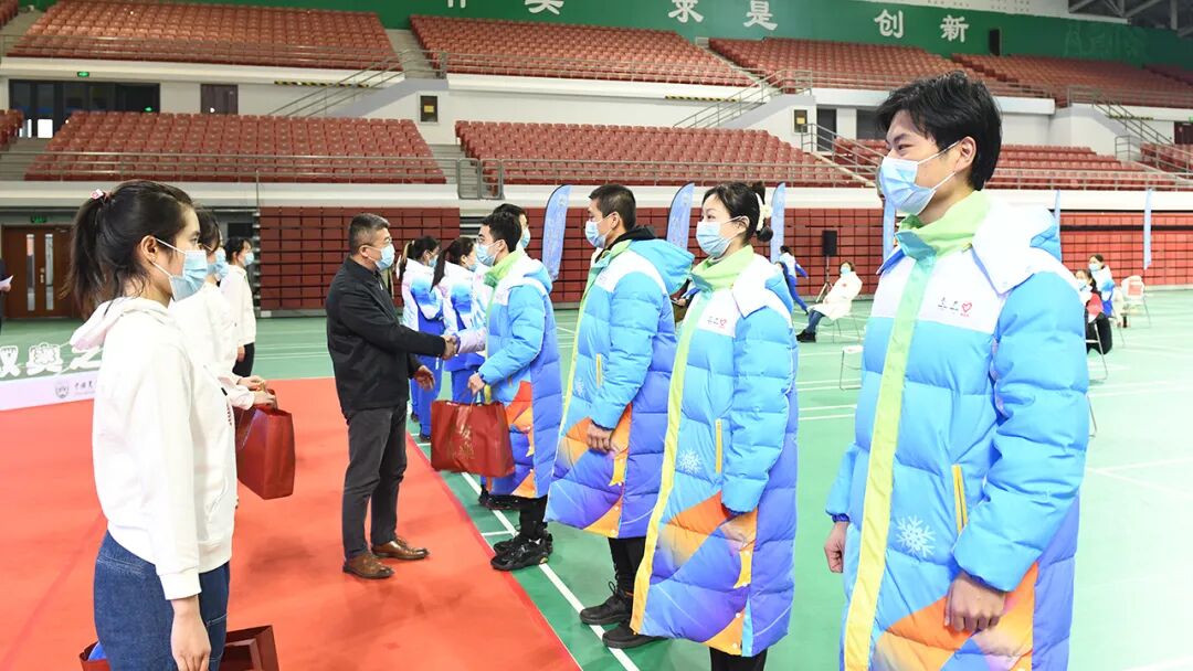 王勇为志愿者代表发放冬奥慰问物资大礼包
