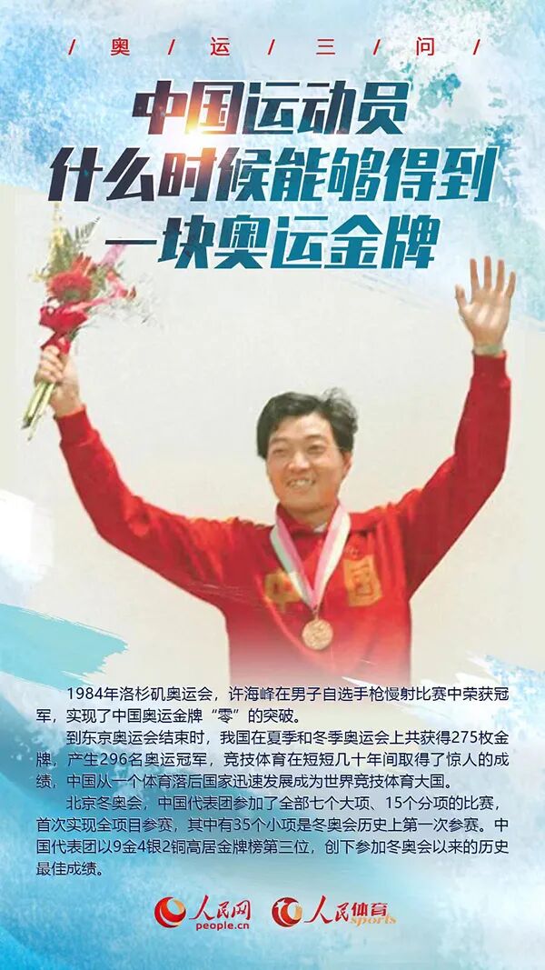 1984年我国在改革开放后首次组队参加夏季奥运会。这是中国首次全程参与夏季奥运会。中国队共夺得15枚金牌、32枚奖牌的好成绩,就在开幕后第一天,北体校友许海峰斩获男子自选手枪60发慢射冠军,实现了中国奥运史上金牌榜“零的突破”。中华人民共和国国歌奏响,五星红旗迎风飘扬,时任国际奥委会主席萨马兰奇激动地说:“这是中国体育史上伟大的一天!”西方一家通讯社惊呼:“这是中国五千年历史的一次壮举!”