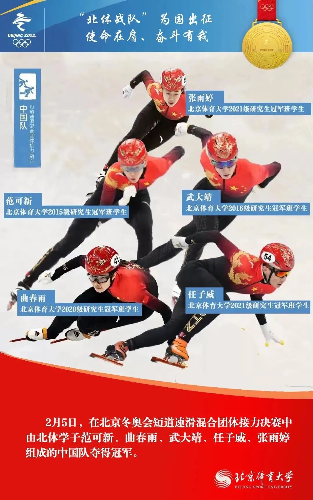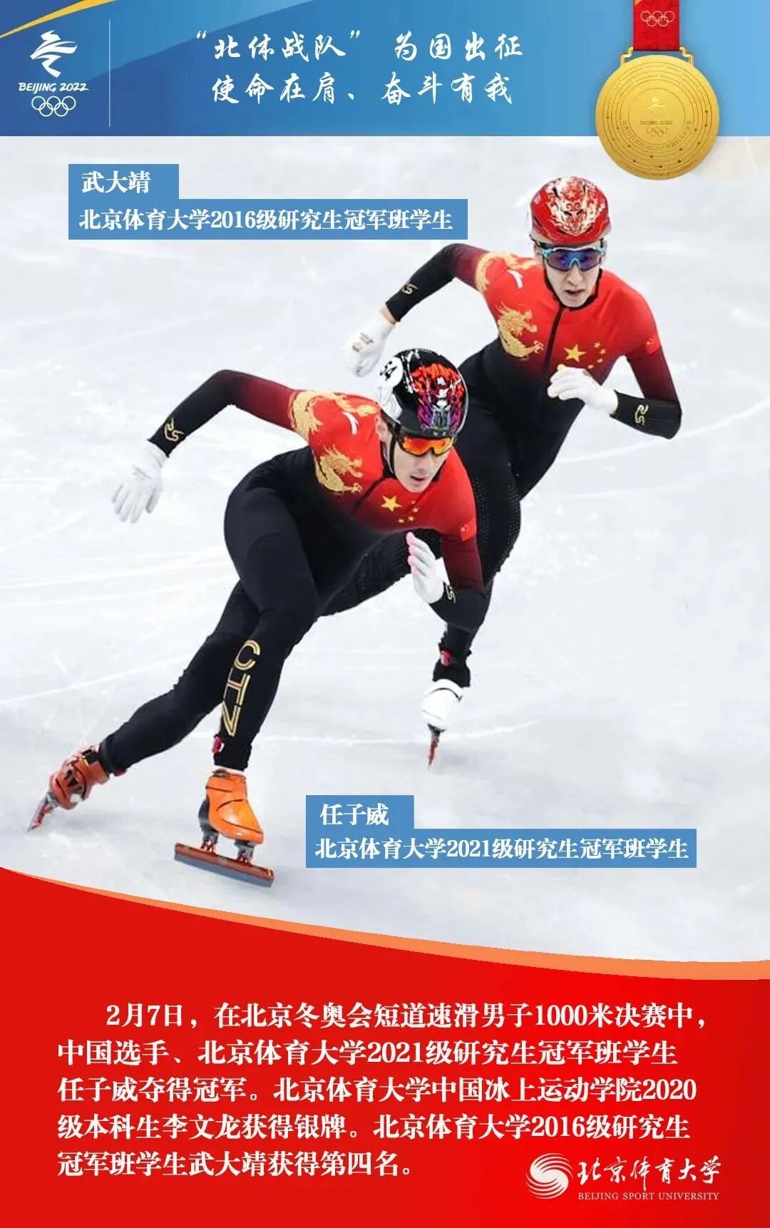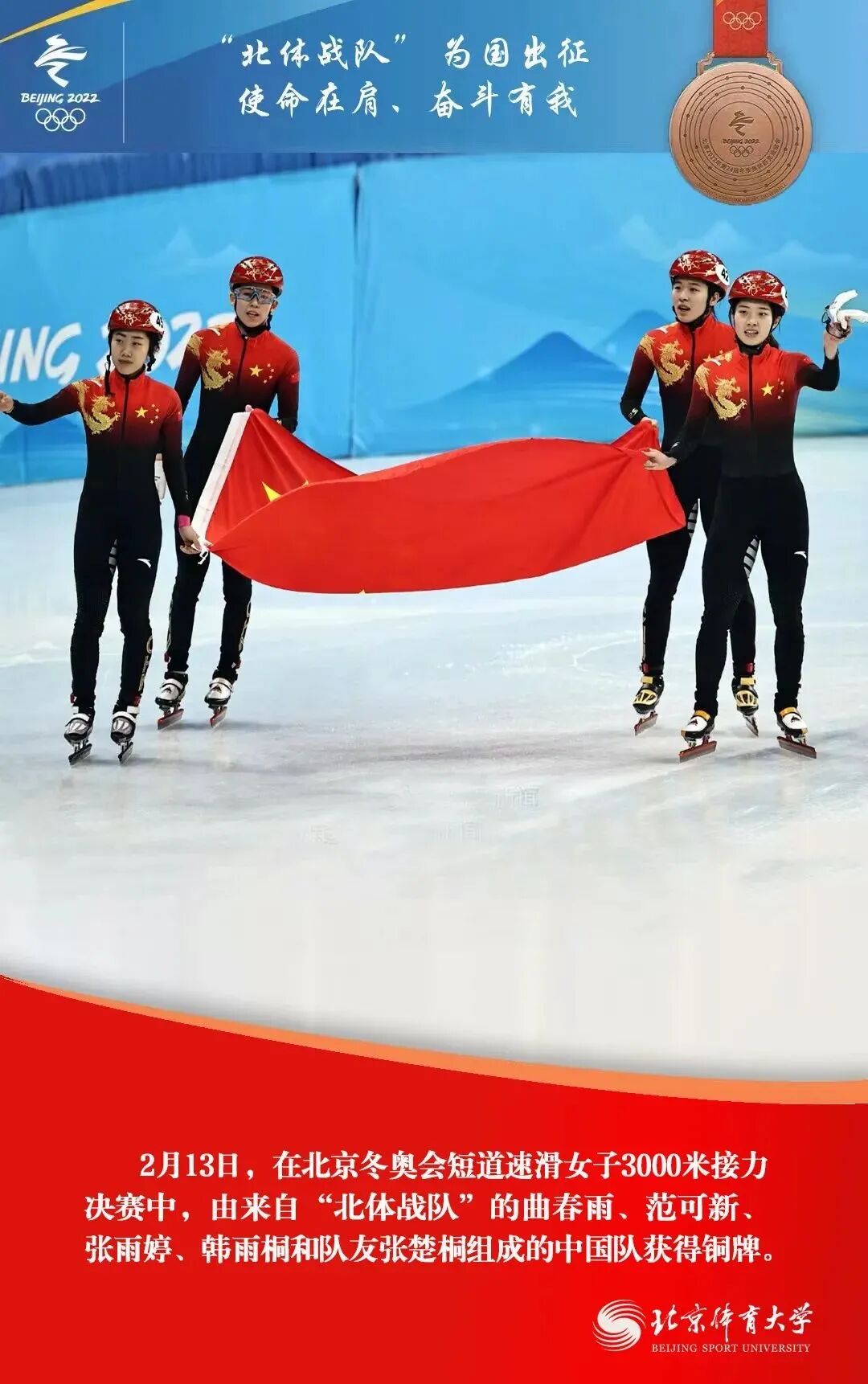 在北京2022年冬奥会上,由北京体育大学师生、校友组成的“北体战队”收获了5金2银1铜,他们以精彩的表现,交出“使命在肩、奋斗有我”的优异答卷。