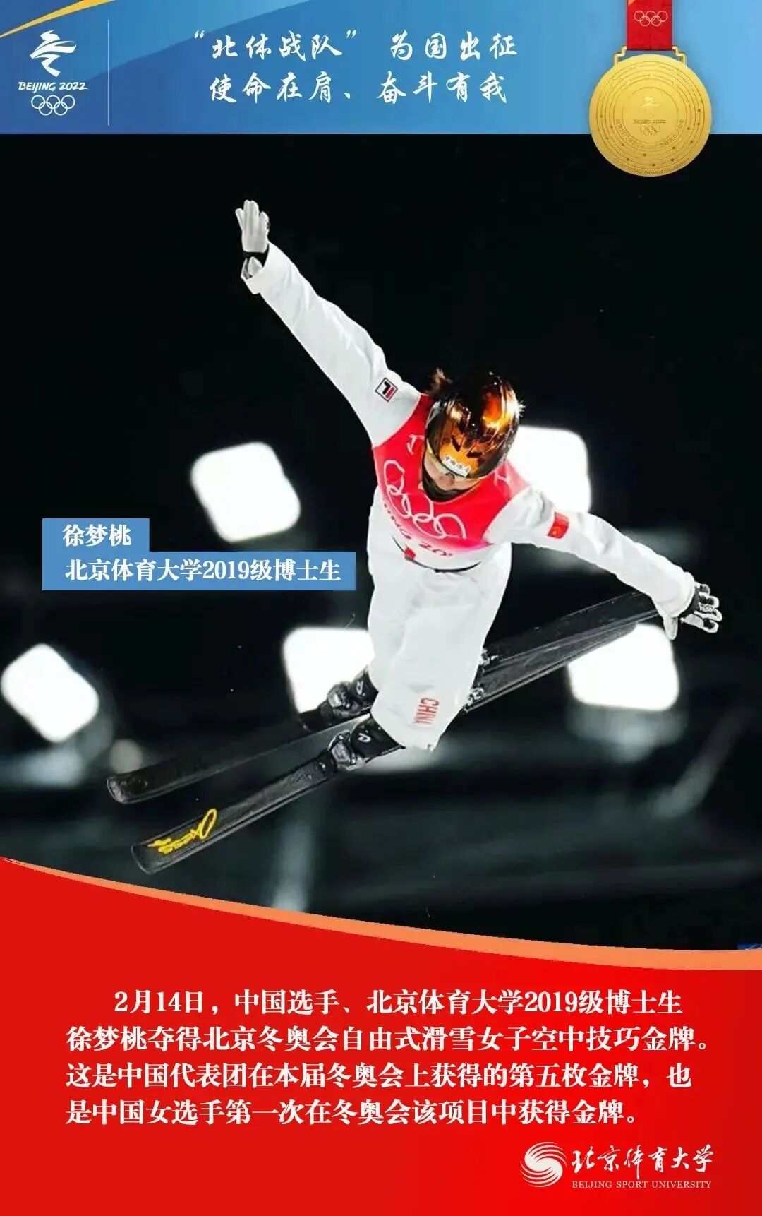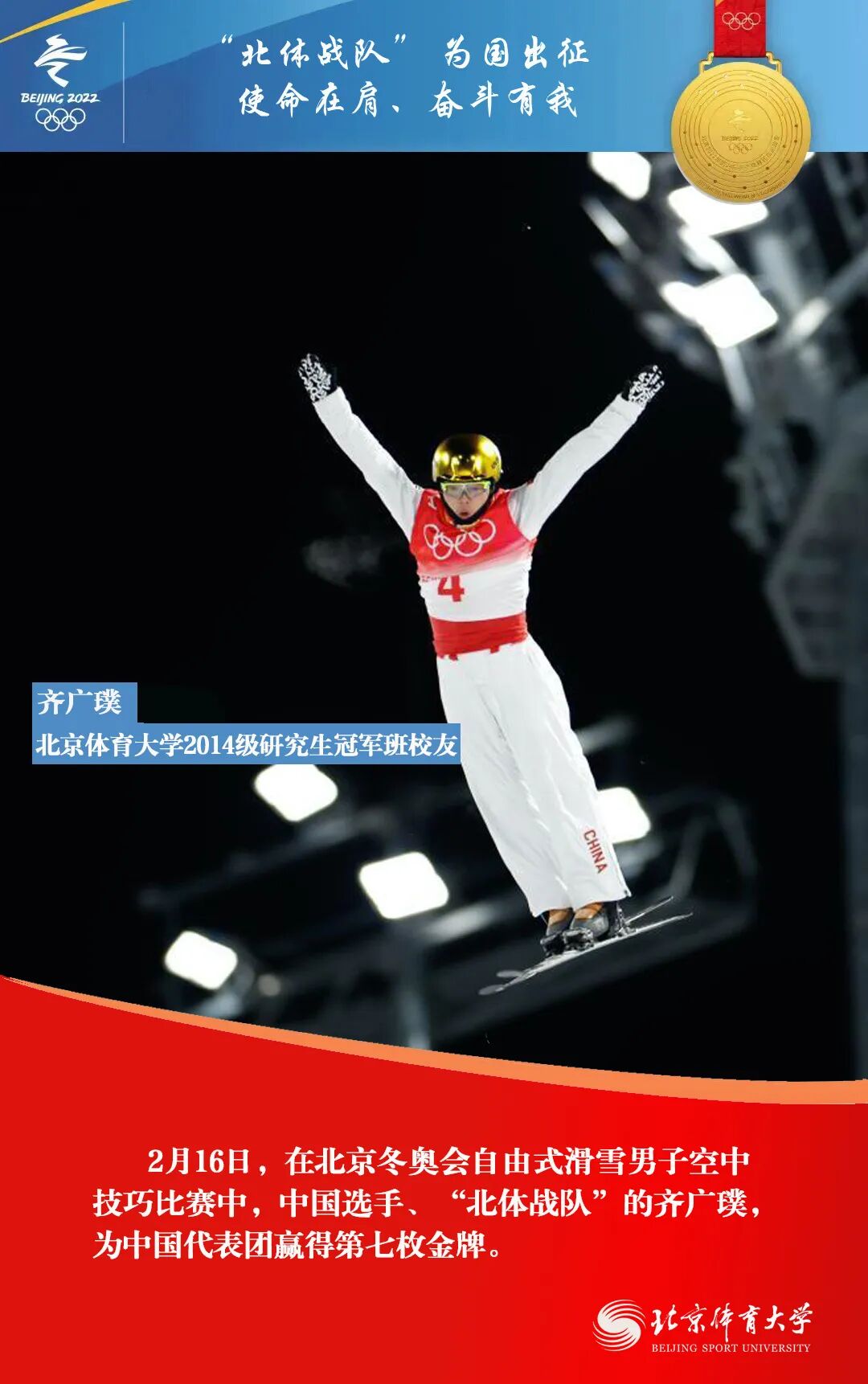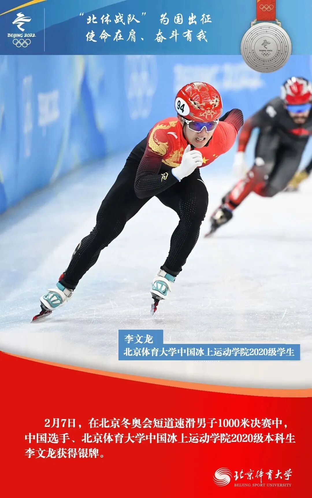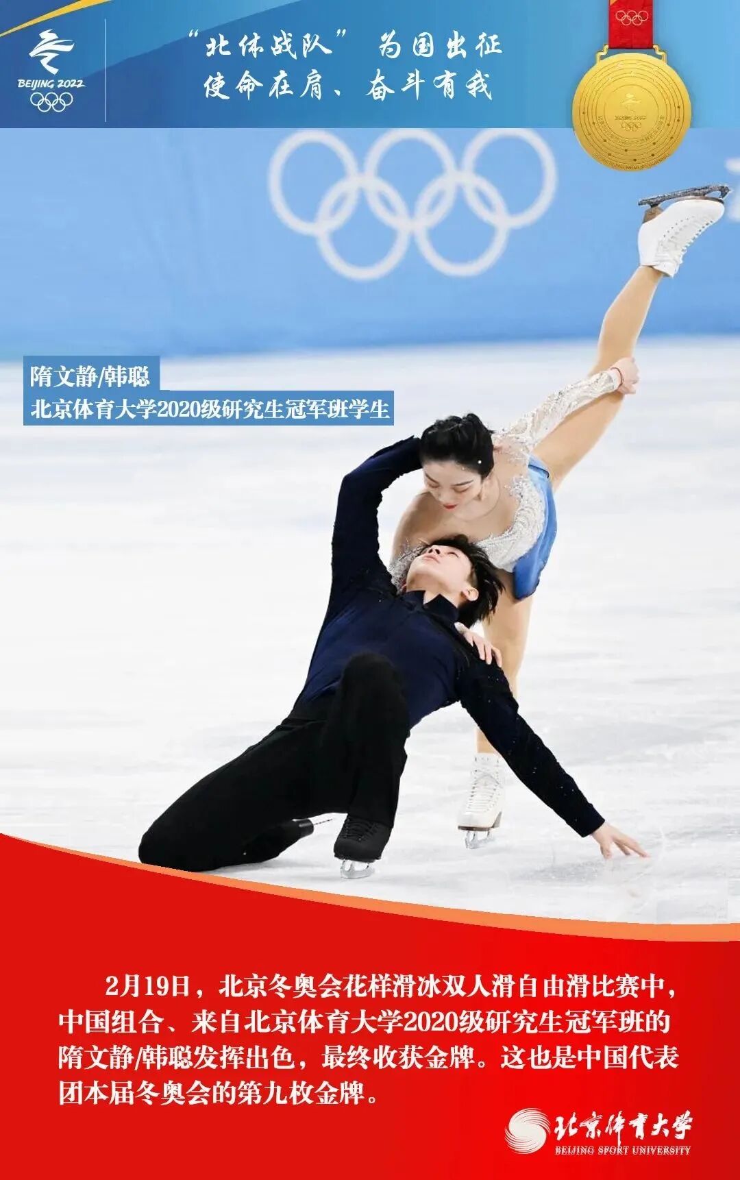 在北京2022年冬奥会上,由北京体育大学师生、校友组成的“北体战队”收获了5金2银1铜,他们以精彩的表现,交出“使命在肩、奋斗有我”的优异答卷。
