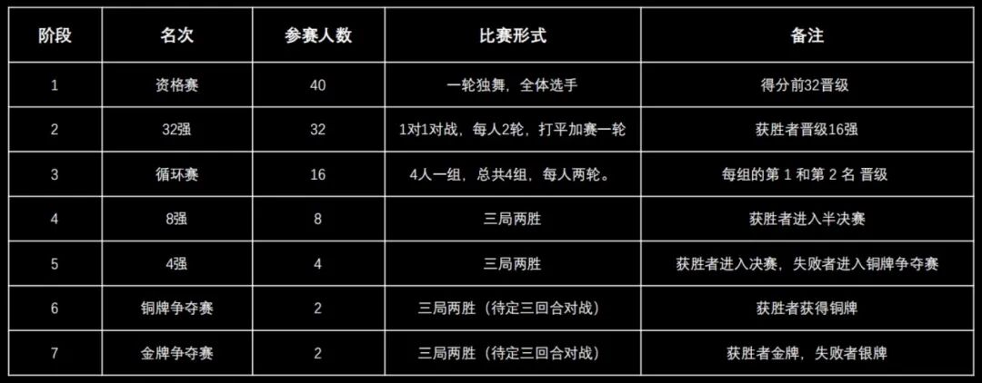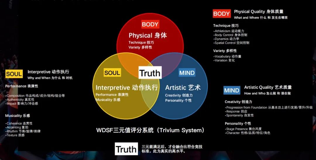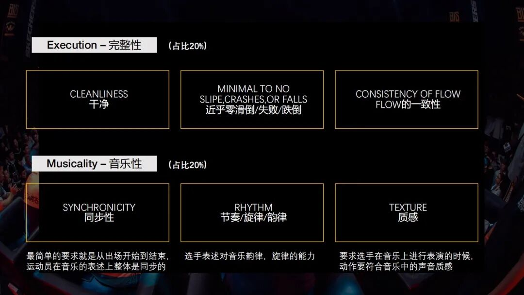 其中,技巧考核选手的运动能力、身体控制、动作能量、空间意识和形态;多样性考核选手的动作数量和变化;原创性考核选手的即兴、创新、自发性和个性;完整性考核选手的动作干净、近乎零失误、flow的一致性;音乐性考核选手的同步性、节奏/旋律/韵律、质感。