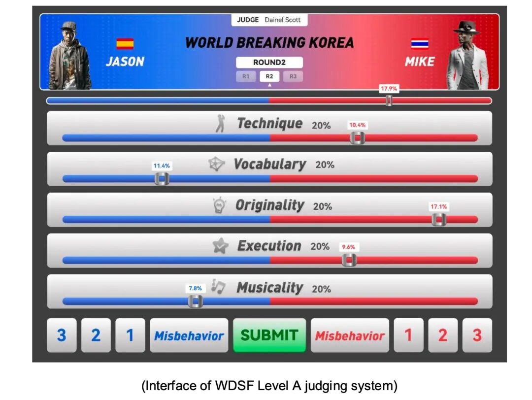 霹雳舞比赛裁判从身体素质、艺术性和演绎表达能力三个方面来评价运动员的表现,技巧、多样性、原创性、完整性和音乐性,每个部分各占20%。