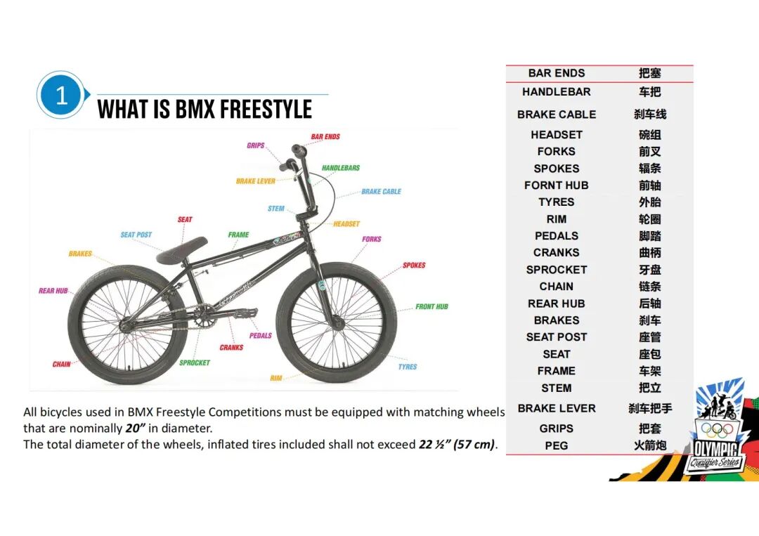 自由式小轮车是一种综合型技术比赛,在比赛的特定时间和场地进行空中飞跃技巧、平衡技巧以及定点技巧等多种类型的技巧展示。比赛没有规定的技术动作、路线,选手需佩戴护具、使用专业BMX自行车,自行安排出发位置,可以利用场地内任意道具,鼓励选手进行技术动作以及线路的创新。