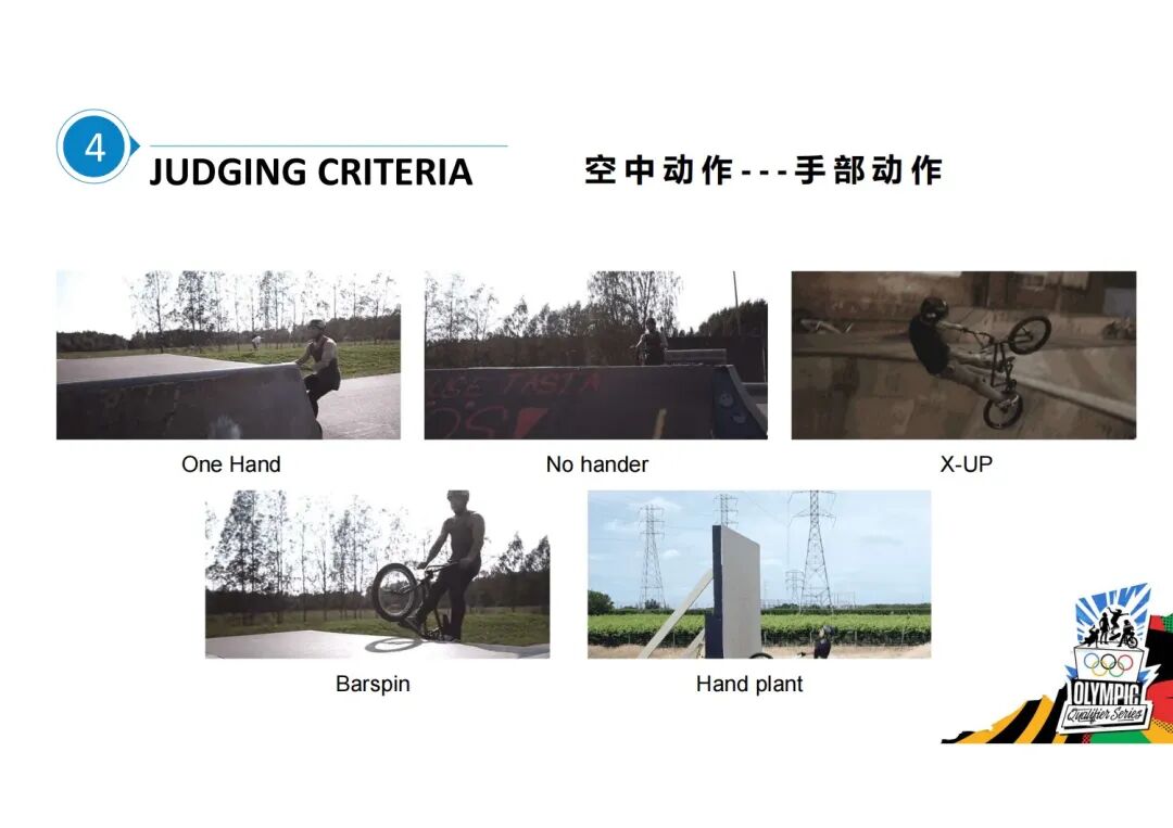 在这之中,难度不单指动作本身的难度,还包括动作完成的位置/道具(如:后空翻加三圈转把过抛台、超远距离的跨道具穿越加神龙摆尾);创新突破指无人尝试,前所未见的动作;动作种类 是看车手掌握和表现各种技巧的能力,包括转体、空翻、转把、神龙摆尾、腾空撒手等以及技术类动作等;完成度 指正确高质量完成动作,三个低质量的动作比不上一个高质量的动作;高度指整轮比赛的完成高度。