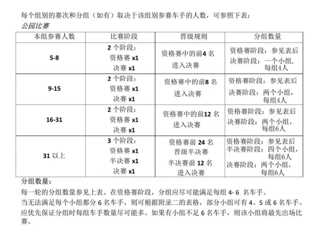 每个组别的自由式小轮车比赛可以由不同赛次(资格赛、半决赛或决赛)组成,在每个赛次由若干个小组赛组成。公园比赛的小组赛由4-6名车手组成。如果某组别参赛人数达到7名,则此7人组成一个分组。