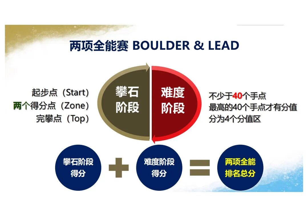 其中,两项全能赛分两个轮次:预赛轮及决赛轮。每个轮次都包含两个阶段:先是攀石阶段,然后是难度阶段。