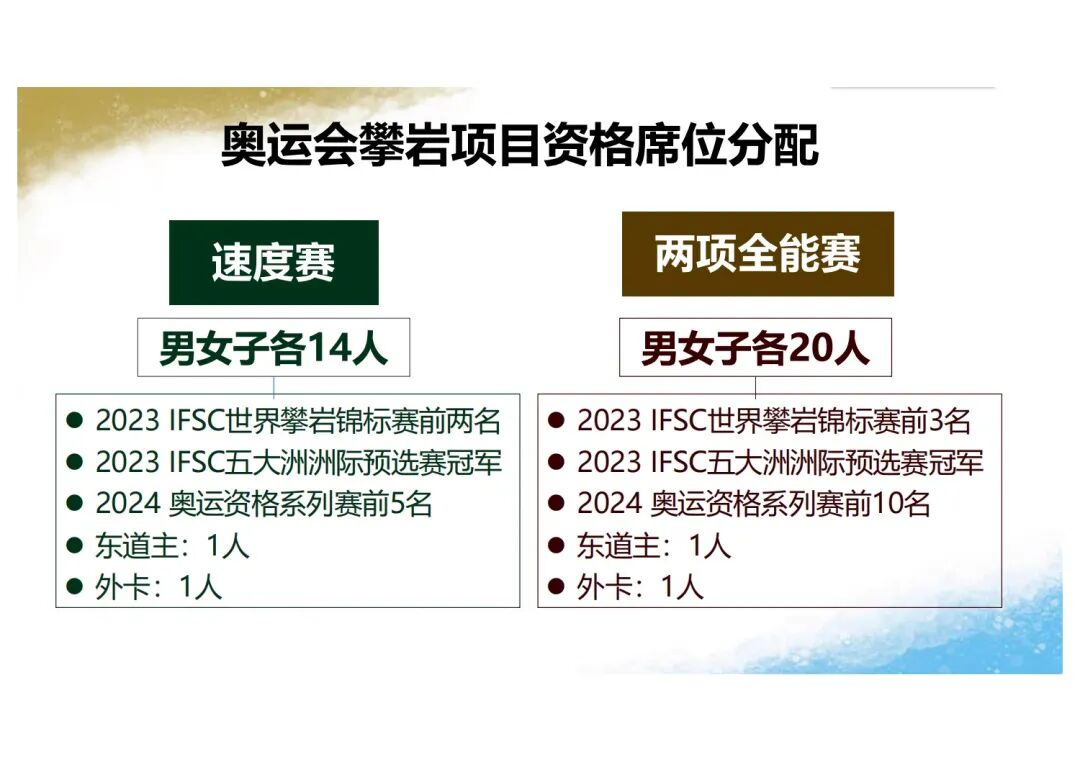 巴黎奥运会攀岩项目将在速度赛和两项全能赛(攀石+难度)上产生男子、女子各两块金牌。