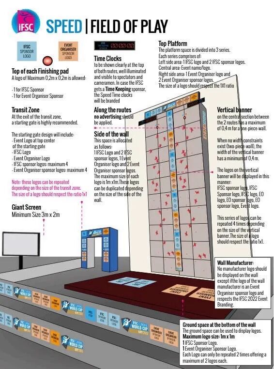 速度赛,以运动员完成一条标准线路所用的时间决定其排名。预赛轮每人攀爬两条赛道,取最好成绩;决赛轮为2-4个阶段的对决淘汰。