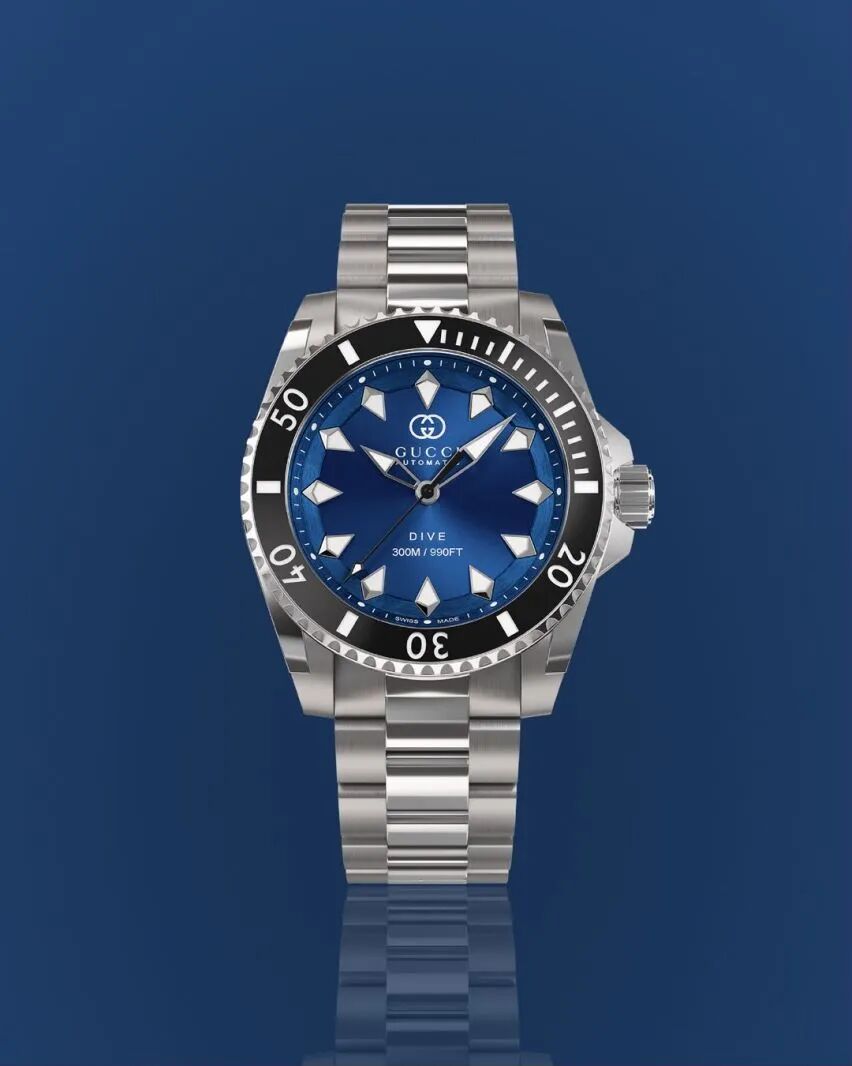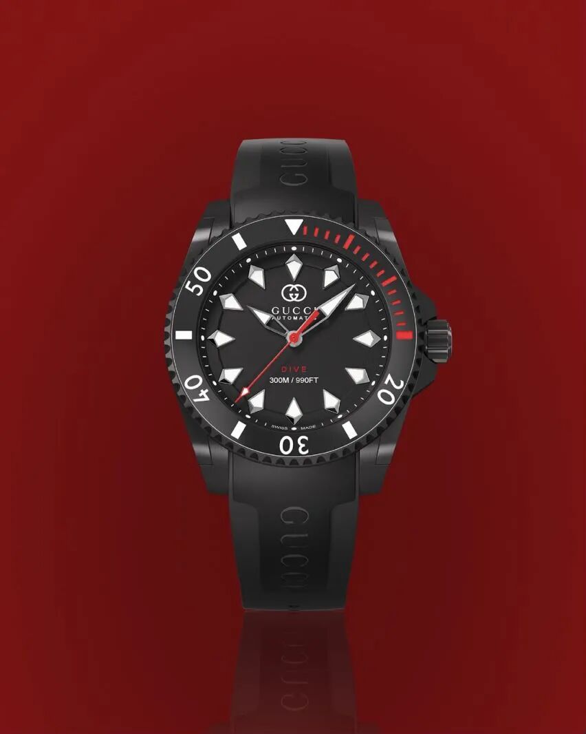 全新Gucci Dive系列腕表以一场时尚摩登的革新,再度彰显了该系列的先锋探险精神。其潜水性能得到了显著提升,防水深度达300米。特别采用单向黑色陶瓷表圈,不仅为腕表增添了硬朗而神秘的质感,同时也确保了更安全的水下计时。