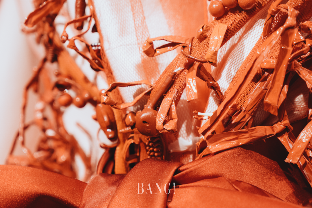 当我们仔细观察,会发现Look43背后蝴蝶结上的装饰是在日常生活中唾手可得却又容易被人们遗忘的小物件,如USB、发圈、耳机等,将这些小物品回收后再利用,设计到衣服上,充分展现了Maison Margiela可循环的时尚理念。