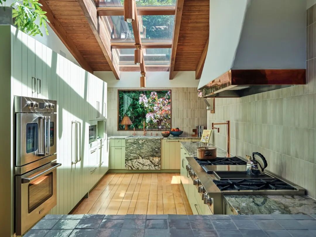 厨房是Emma Chamberlain全屋最喜欢的空间,透明天花板让通透明亮的天光充分洒入,光线在这里被塑造出迷人的形状;她以柔和轻盈的薄荷绿和鼠尾草绿作为主色调,同色系瓷砖由bedrosian出品,复古炉灶和不锈钢烤箱来自Bluestar。