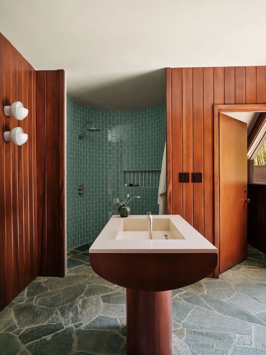 穿过休息室,你会到达一处灵感来自帆船内部的盥洗室,这里也被Emma Chamberlain称为派对浴室,她的朋友们会在游泳狂欢后聚集于此;淋浴空间运用了蓝绿色Daltile玻璃瓷砖,与铺设的木色雪松木镶板相互映衬;老式烛台由RAAK出品。