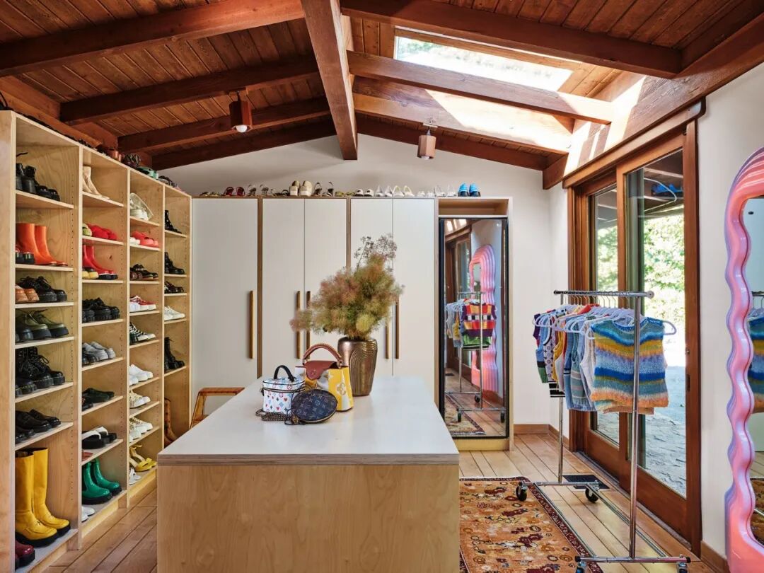 Emma Chamberlain拥有一个宽敞明亮的步入式衣橱,她所喜欢的老奶奶风格编织背心均放置于此,不擅长穿高跟鞋的她把这类鞋款放在鞋柜的最高处;一面Ettore Sottsass镜子为空间带来梦幻气息,实用开门式衣柜由Woodharmonic出品。