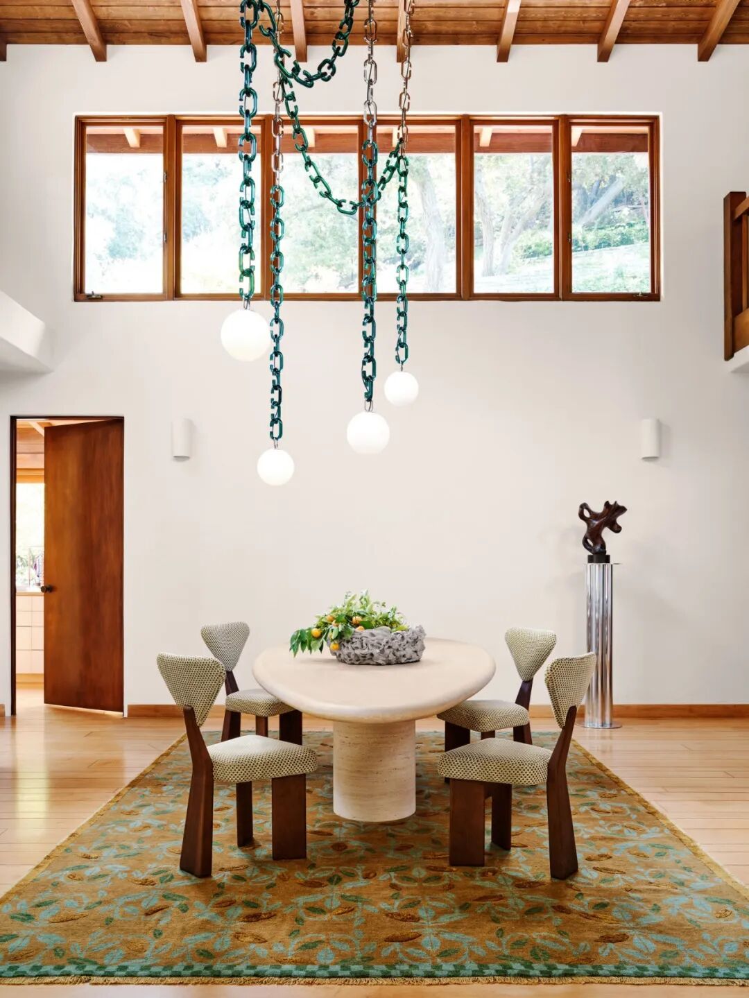 抵达餐厅区域,这里也是全屋挑高最高、最开阔的空间之一,Emma说自己不喜欢在餐桌上吃饭,她觉得这里最终会成为她拼拼图、画画、做手工的地方。一盏由A Trueing Studio设计的链索吊灯,悬挂于Martin Massé设计的餐桌上方,四把餐椅出自Juliana Lima Vasconcellos之手;地毯由家具商Christopher Farr出品;立于墙面的雕塑作品出自Joe Garnero之手。