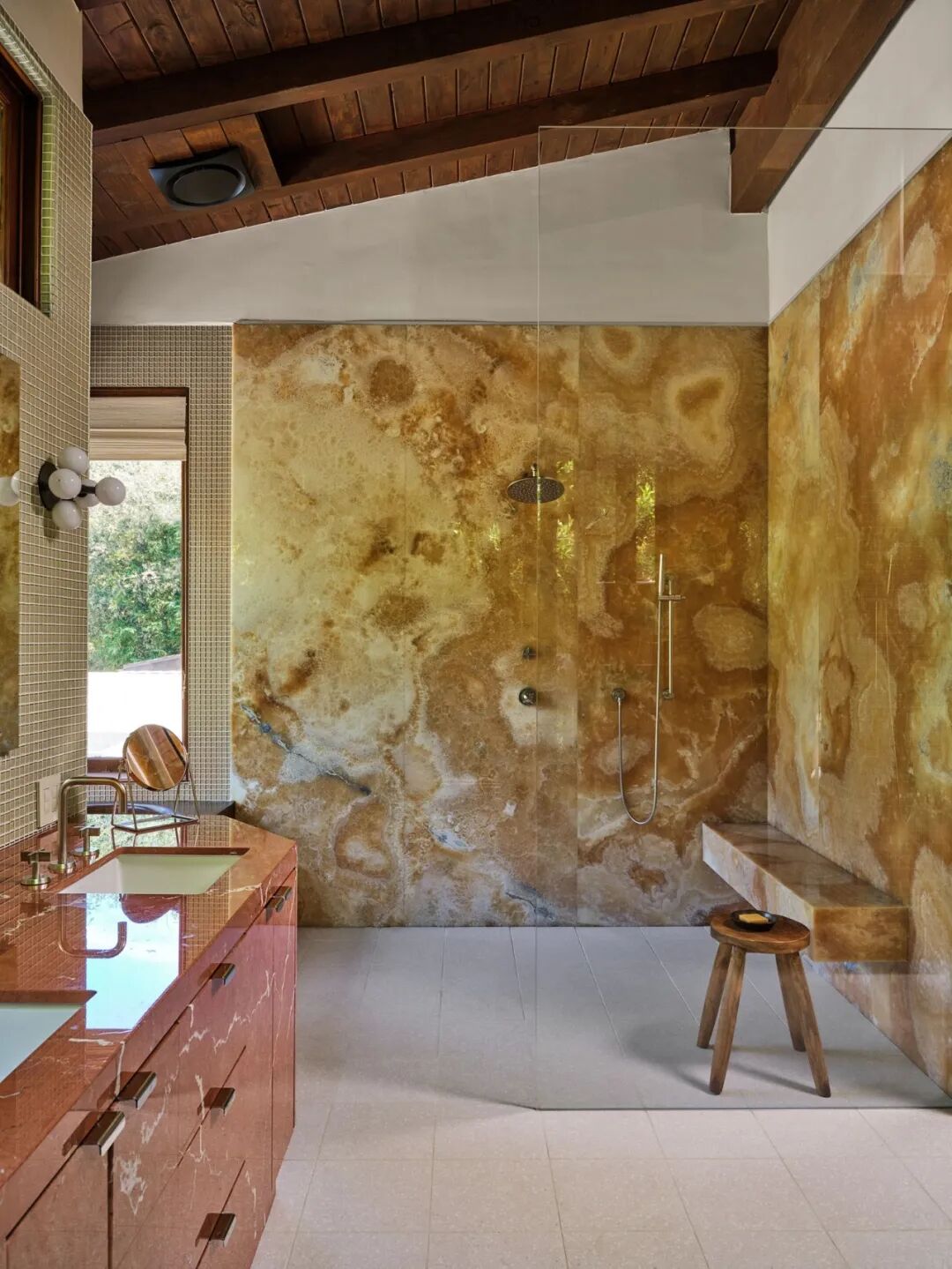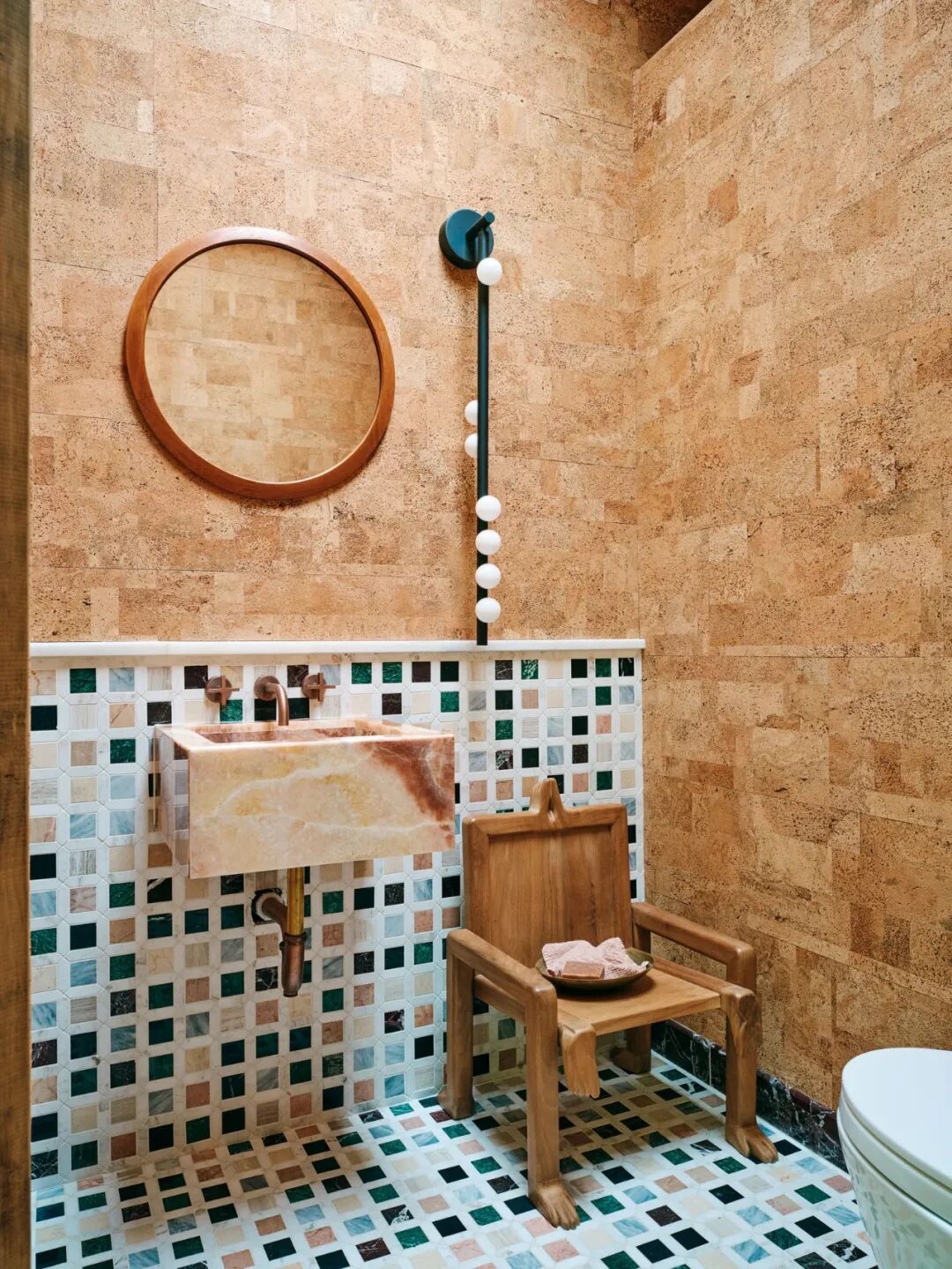 设计师把户外地板的石头铺进这个空间,处于空间中央的水槽是房子原本自带的,“这个水槽是一个天才又疯狂的设计,来玩的朋友们最后都会聚集在这里洗手,这有点像派对浴室,我也把这里称为燧石族浴室,因为它仿佛带有燧石族的能量。”她继续说。