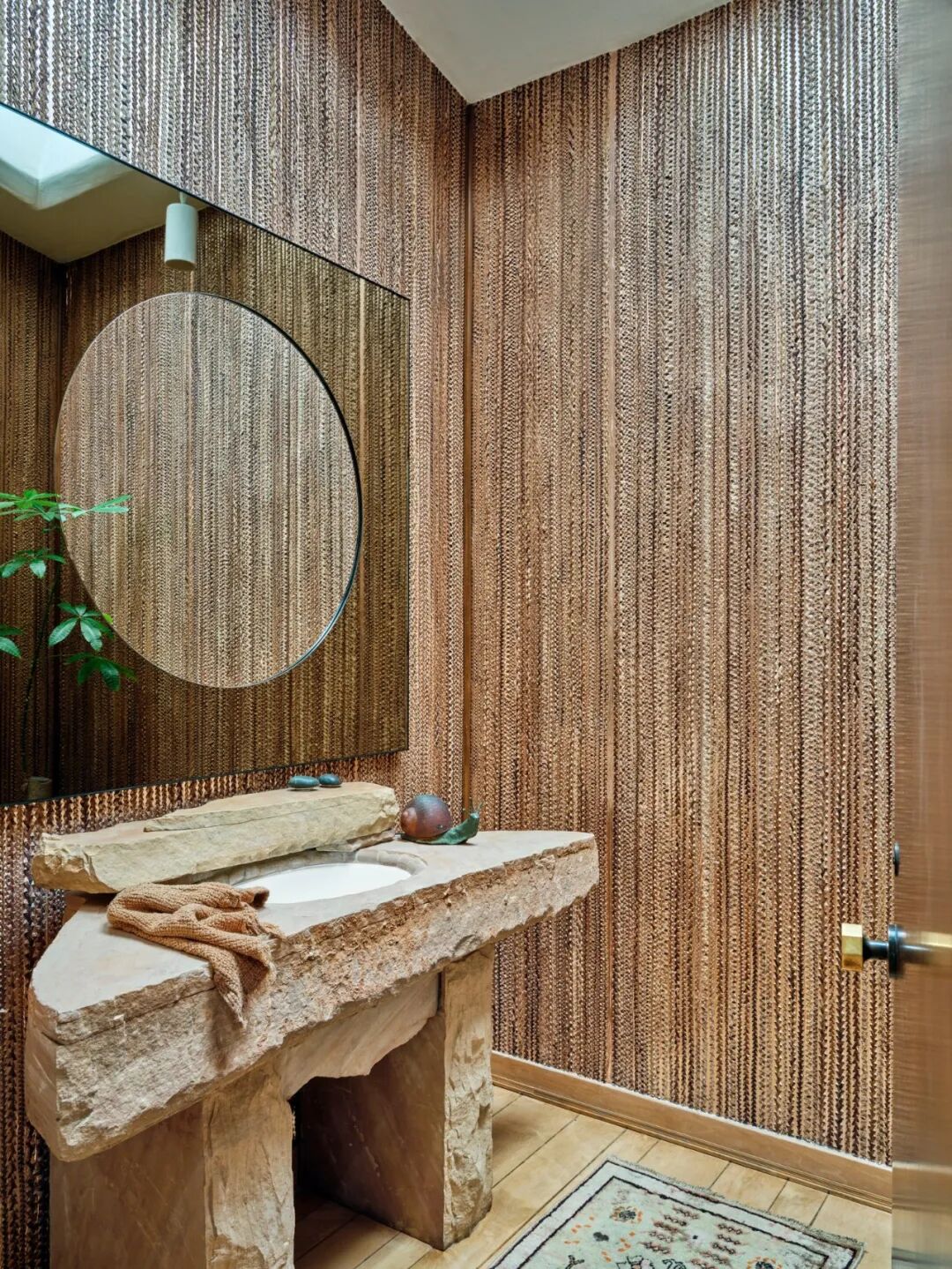 另一处盥洗室的也使用了奇特的材料,设计师用Schumacher出品的Bacbac(香蕉树皮)编织材料覆盖了一面墙,“说实话,这让我想起了蜂巢,它看起来很好吃,说得好像我真的会吃它似的。”Emma说。