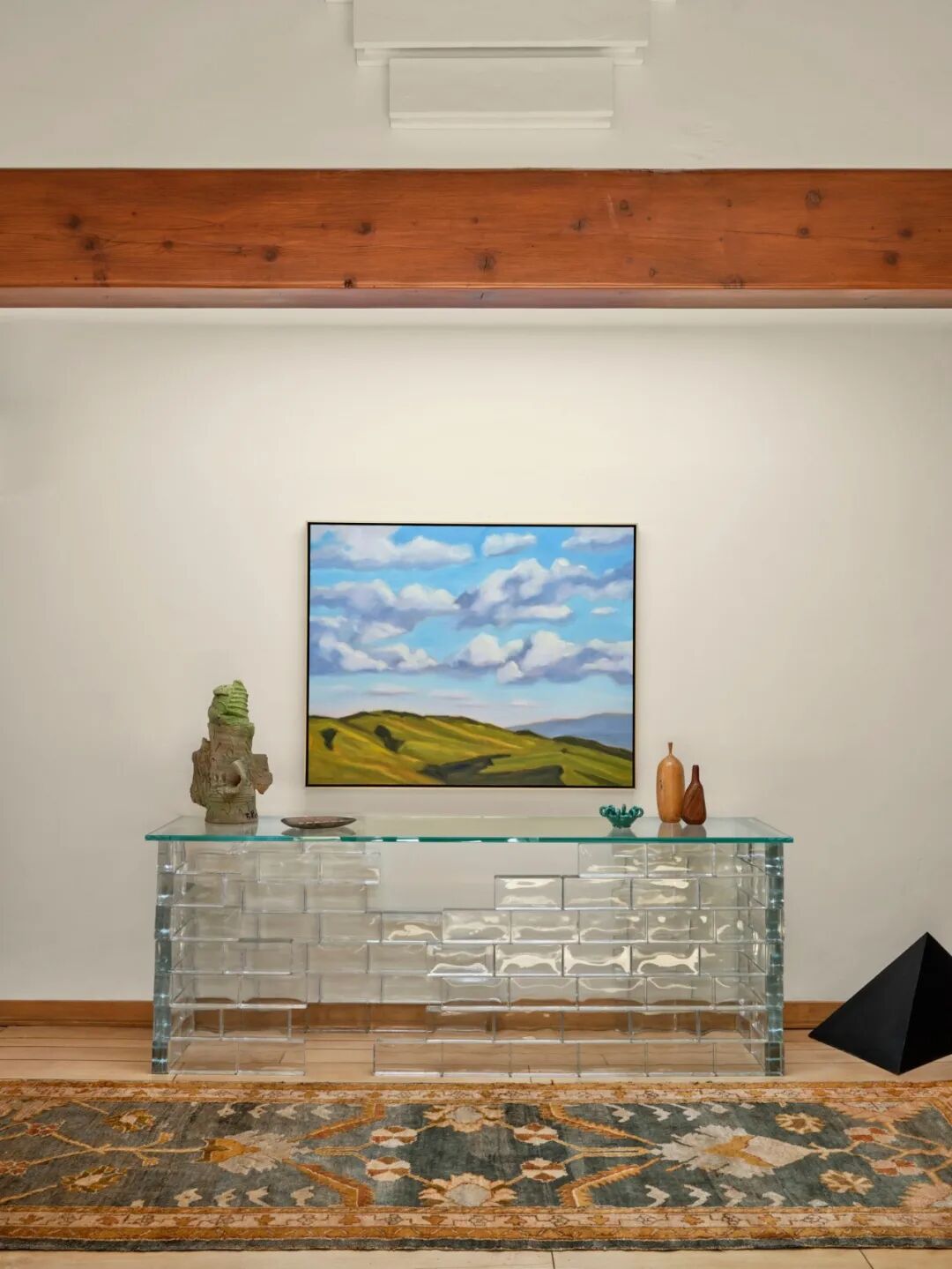 悬挂于入门处的风景画由Emma Chamberlain的父亲Michael Chamberlain创作;玻璃砖打造的边桌由Proem Studio定制;左边的陶瓷雕塑为美国陶瓷雕塑家Stan Bitters的作品。