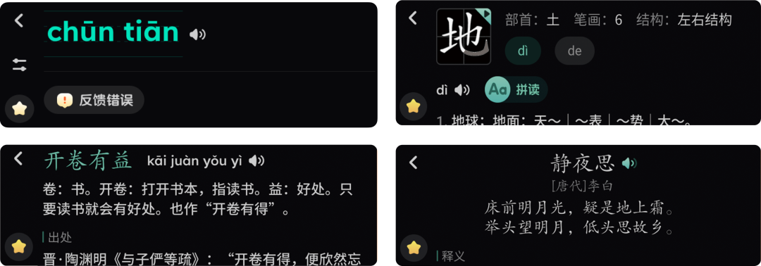 讯飞AI翻译笔P20 、P20 Plus均支持中文字、词、句、古诗文学习。汉字拼音、释义、笔顺笔画动态展示,规范书写;成语释义、出处、典故等全方位学习。古诗文标题或句子轻轻一扫即可查询全诗,逐句对照字词注释和大意,更有古诗词原文、白话文赏析、作者简介等内容的真人讲解音频,声情并茂,学习更生动。