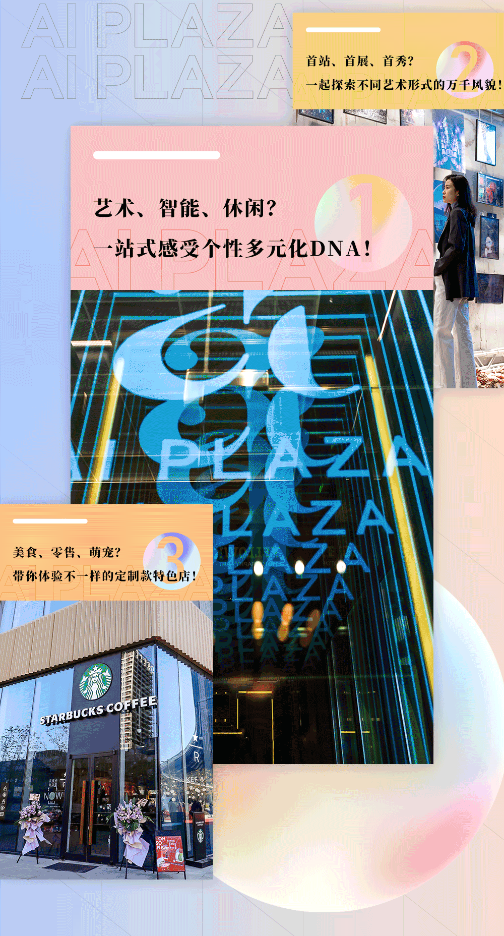 当你漫步于商场时,AI PLAZA标志性的「ai」符号也随处可见。AI开箱、AI潮玩、AI萌宠、AI味来、AI凝聚...并以拼接、解构、抽象等多样艺术方式为你呈现。了解了那么多,你是否还好奇AI PLAZA有哪些超出片的打卡点呢?圈圈已为大家总结完毕,从外到内,带你一键拍出时髦大片!![]()