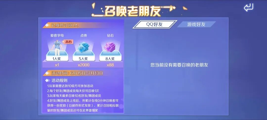 6月15日至7月13日期间,召唤一定数量的老朋友回归,可得钻石*88、套装-爱意字母、点券*2000~