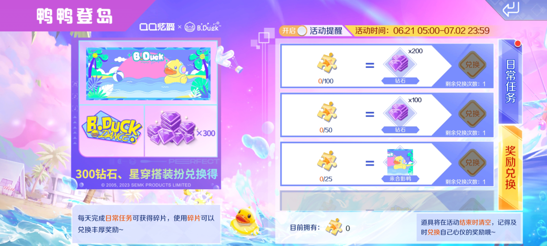 6月21日至7月2日,完成日常任务可获得碎片,使用碎片可以兑换钻石*300、星穿搭背景-来合影鸭、星穿搭贴纸-英文鸭丰厚奖励!